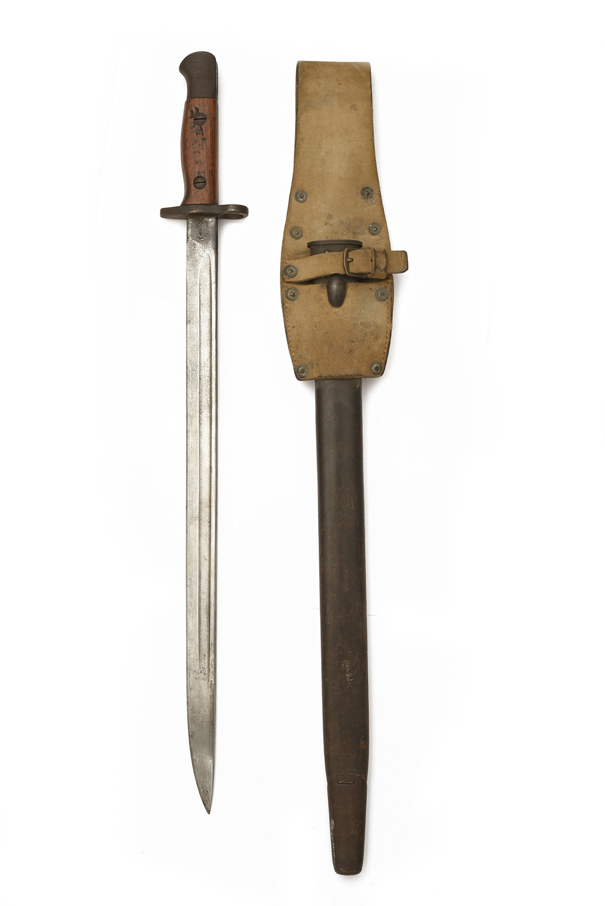 A PATTERN 1907 SWORD BAYONET FOR THE SMLE RIFLE, dated 12.14, with 17 in. single-edged steel blade fullered on each side, ricasso with king's crown over 'E R / 1907 / 12, / 14 / EFD', with Broad Arrow, inspection marks and bent test 'X' over, wooden grips stamped 'B319B' and pommel '3RCI / 319', together with its back leather scabbard with steel fittings and 9-rivet Slade Wallis frog stencilled '6 / GD / D / 858', 23 1/2 in. overall