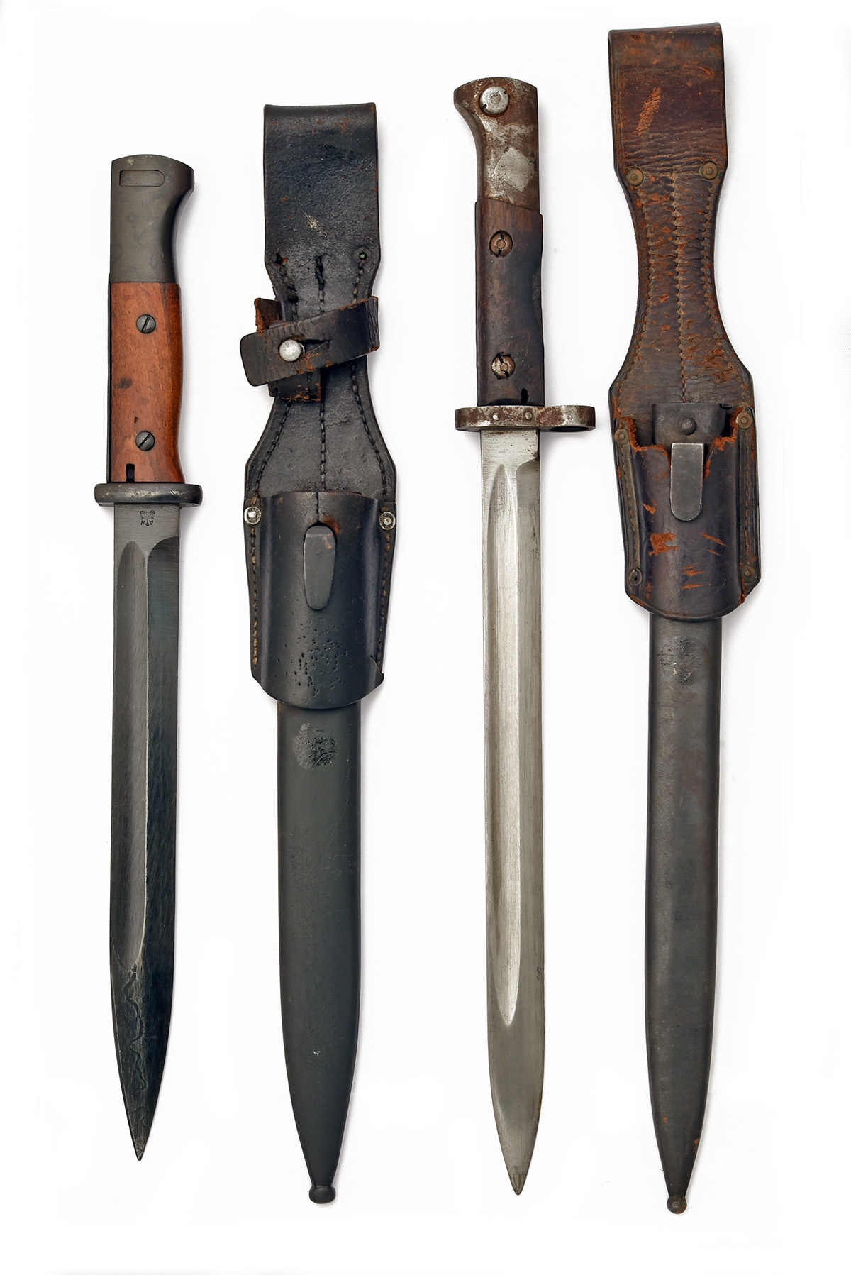 A PAIR OF BAYONETS FOR THE MAUSER K98k CARBINE, 1) a probable post-war East German refurb , with 10 in. single-edged steel blades fullered on each side, ricasso with AWS and scales mark of Coppel, steel cross-guard and hilt with wooden grips, together with ts black painted scabbard an black leather frog, frog worn with strap torn, 16 1/2 in. overall; 2) a Czechoslovak Model VZ23 "Long" Bayonet with 11 3/4 in. single-edged steel blade fullered on each side with ricasso marked 'CSZ / U', steel cross-guard and hilt, wooden grips, together with its black steel scabbard and black leather frog, worn, losses to grips, frog worn with losses, 18 in. overall