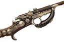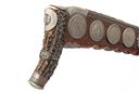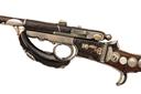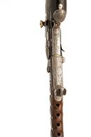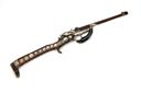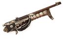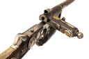 probably built on a Quackenbush Bicycle Rifle circa 1925, with reptile-skin covered 12in. barrel not including its matching detachable muzzle-cover, silver mounts at muzzle, the sideways hinged breech with rose gold mounts, blade fore-sight and tunnel rear-sight, lizard skin covered grip area and breech, hinged walnut butt with hooked natural stag heel-plate and drilled to the underside for storage of ammunition, the whole profusely decorated in multi-national white metal coins and salvaged silver pieces with further applied gold detail and with moulded horn fore-grip, in a soft leather holster