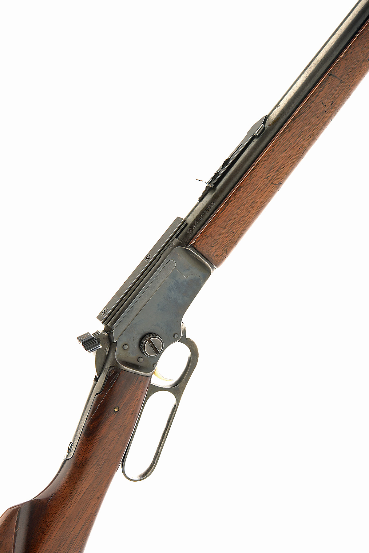 MARLIN .22 S.L. / L.R. 'GOLDEN 39-A MOUNTIE' LEVER-ACTION REPEATING TAKE-DOWN SPORTING RIFLE, serial no. U12108, dated 1960, 20 1/4in. nitro barrel, ramp-mounted bead fore-sight, leaf rear-sight, scope rail, half-cock safety, tubular magazine, straight stock (cracked at the hand), sling swivels, broken heelplate