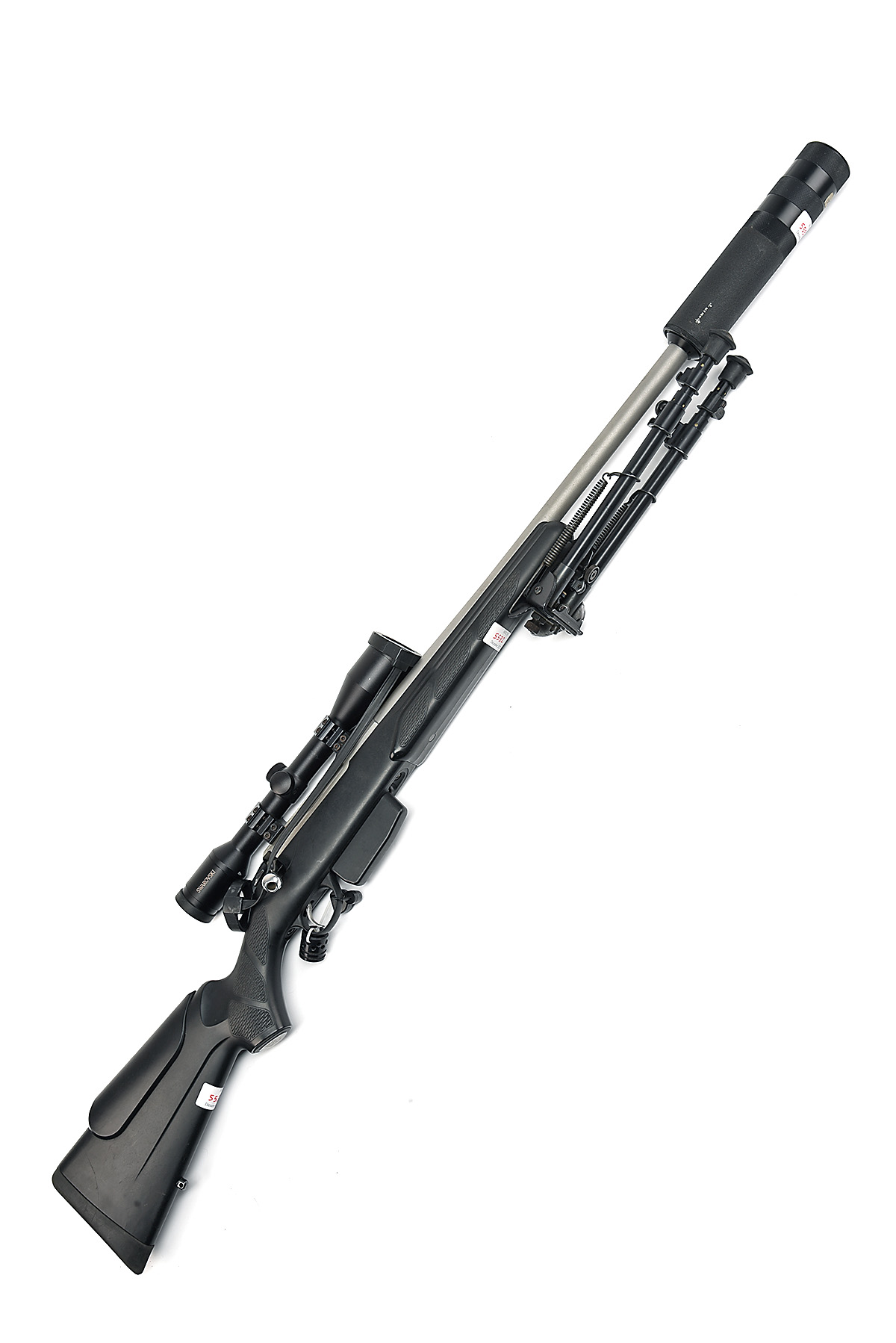 TIKKA .223 REM. 'T3' BOLT-MAGAZINE SPORTING RIFLE, serial no. 733718, 24in. unsighted nitro barrel, threaded for sound moderator, fitted with a swarovski 6x42 habicht telescopic sight, manual safety, detachable magazine, folding bipod, pistolgrip synthetic stock, Wildcat Predator 8 9in. sound moderator,
