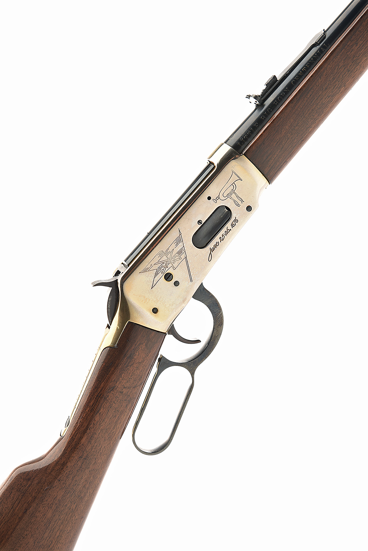 WINCHESTER .44-40 WIN 'MODEL 94' 'LITTLE BIG HORN CENTENNIAL' LEVER-ACTION REPEATING SPORTING RIFLE, serial no. LBH01851, 19 3/4in. nitro barrel ramp-mounted bead fore-sight, leaf rear-sight, two brass bands, brass action with left side American Indian 'the 7th and the faux' with saddle ring, rifle barrel marked with crossed swords and flag, bugle 'JUNE 25.26,1876' straight stock with 'LITTLE BIG HORN CENTENNIAL 1876-1976' medallion