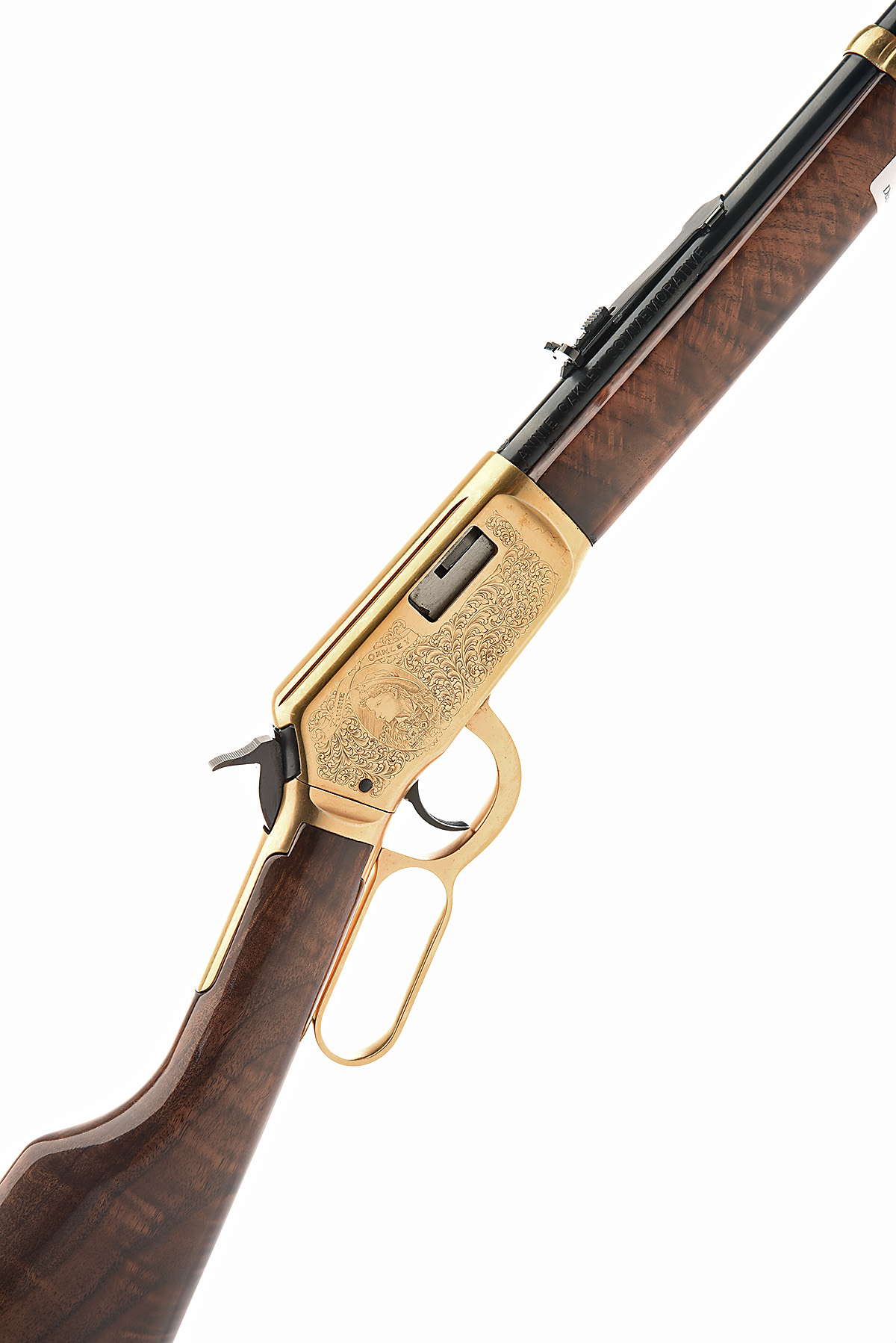 WINCHESTER .22 S-L or L.R. 'MODEL 9422 XYR' ANNE OAKLEY COMMEMORATIVE LEVER-ACTION REPEATING RIFLE, serial No. AOK3184, 20 1/4in. nitro barrel, protected ramp-mounted bead fore-sight, rear leaf-rear-sight, half-cock safety, engraved gold action with gold lever and gold bands, full-length tubular magazine, polished fore-end and stock, stored in green stock