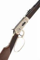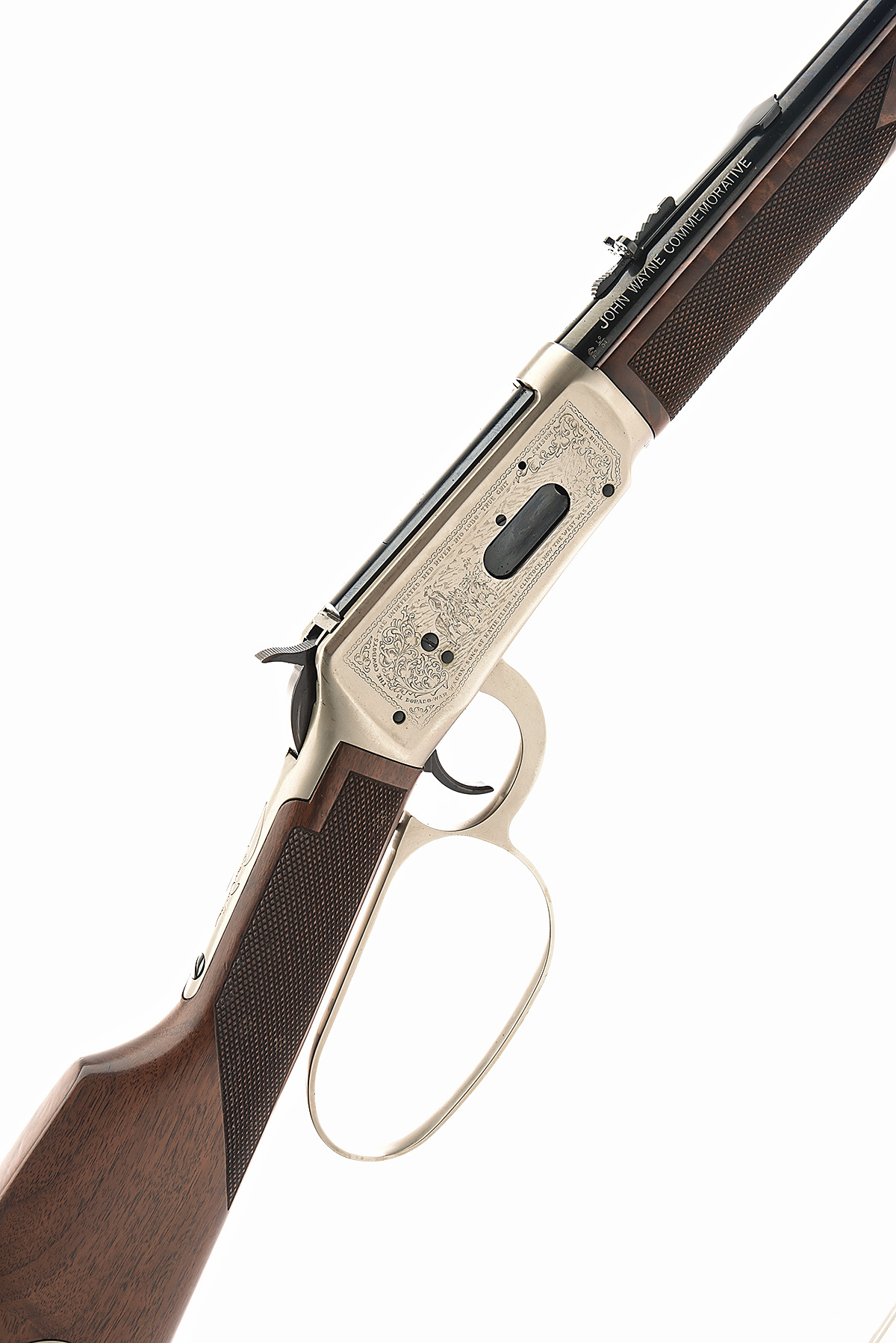 WINCHESTER .32-40 'MODEL 94 JOHN WAYNE COMMEMORATIVE' UNDER-LEVER REPEATING SADDLE-RING CARBINE, serial no. JW25447, 18 1/4in. nitro reproved barrel with adjustable open sights, full length tubular magazine, bright action with stage coach and cattle driving scenes, bordered with the names of John Wayne western films, saddle-ring, enlarged under-lever, stock inset with a medallion with portrait of John Wayne, including a suede leather tooled saddle holster, together with 40 rounds of ammunition