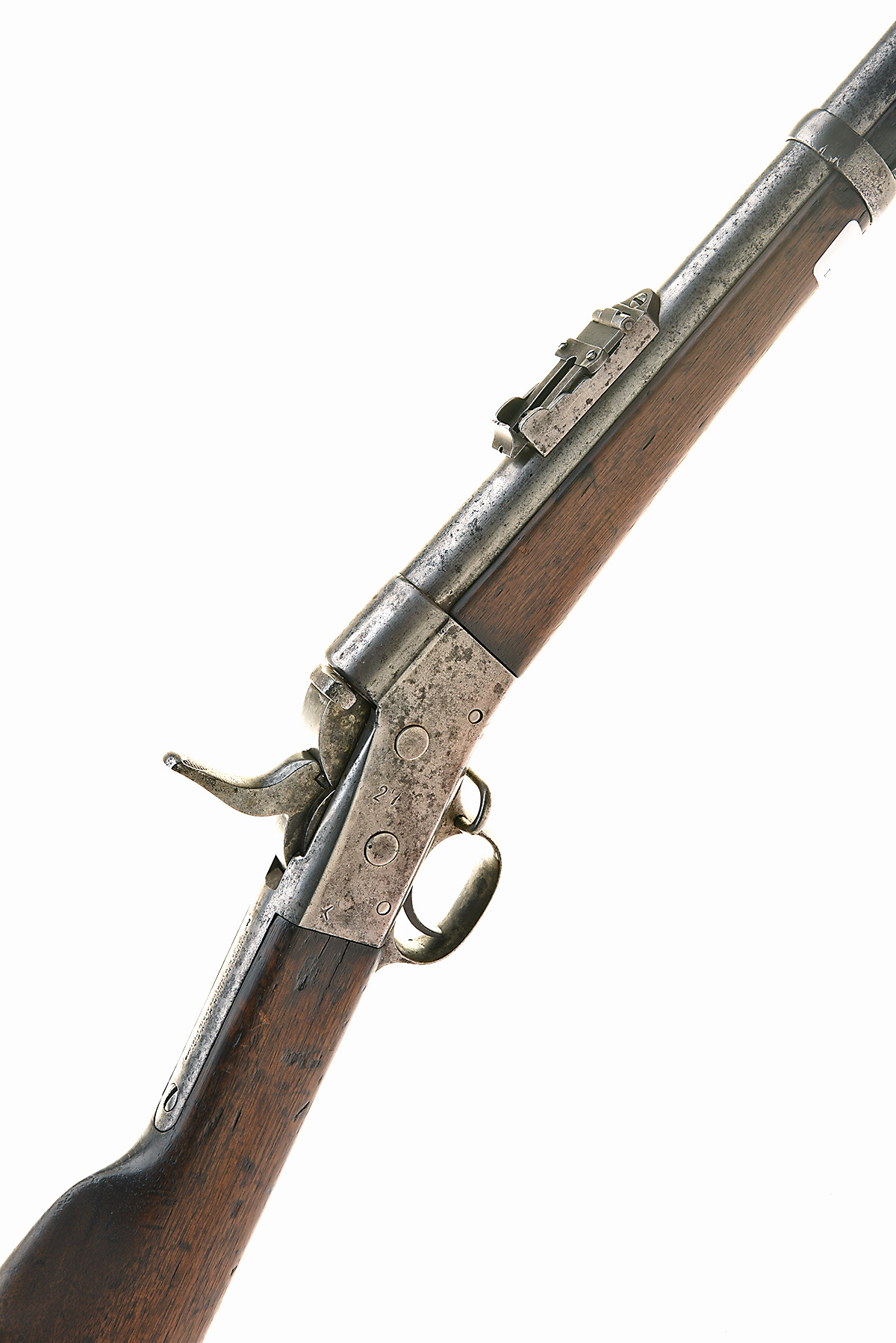 with 36in. barrel, block fore-sight, ladder rear-sight, rolling block action with inspectors stamps, walnut butt-stock and full-length fore-end, three iron barrel-bands and jag-tipped clearing rod