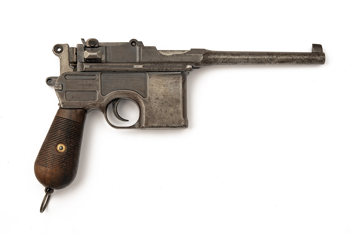 circa 1914, with tapering 5 1/2in. barrel, short extractor claw to bolt, 1000 metre rear-sight, small ring hammer with new style safe, milled sides to the frame, 31-groove walnut bag-shaped grips, fair traces of finish, complete with a good reproduction holster-stock