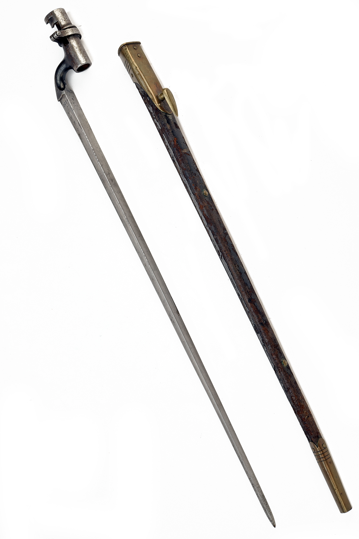 AN EGYPTIAN SOCKET BAYONET FOR THE .303 MARTINI RIFLE, circa 1900. with 21 1/2 in. triangular blade, ricasso marked with Farsi script, brown leather scabbard with brass fittings stamped with Enfield inspection mark, Broad Arrow and 'WD', scabbard worn, 25 1/2 in. overall