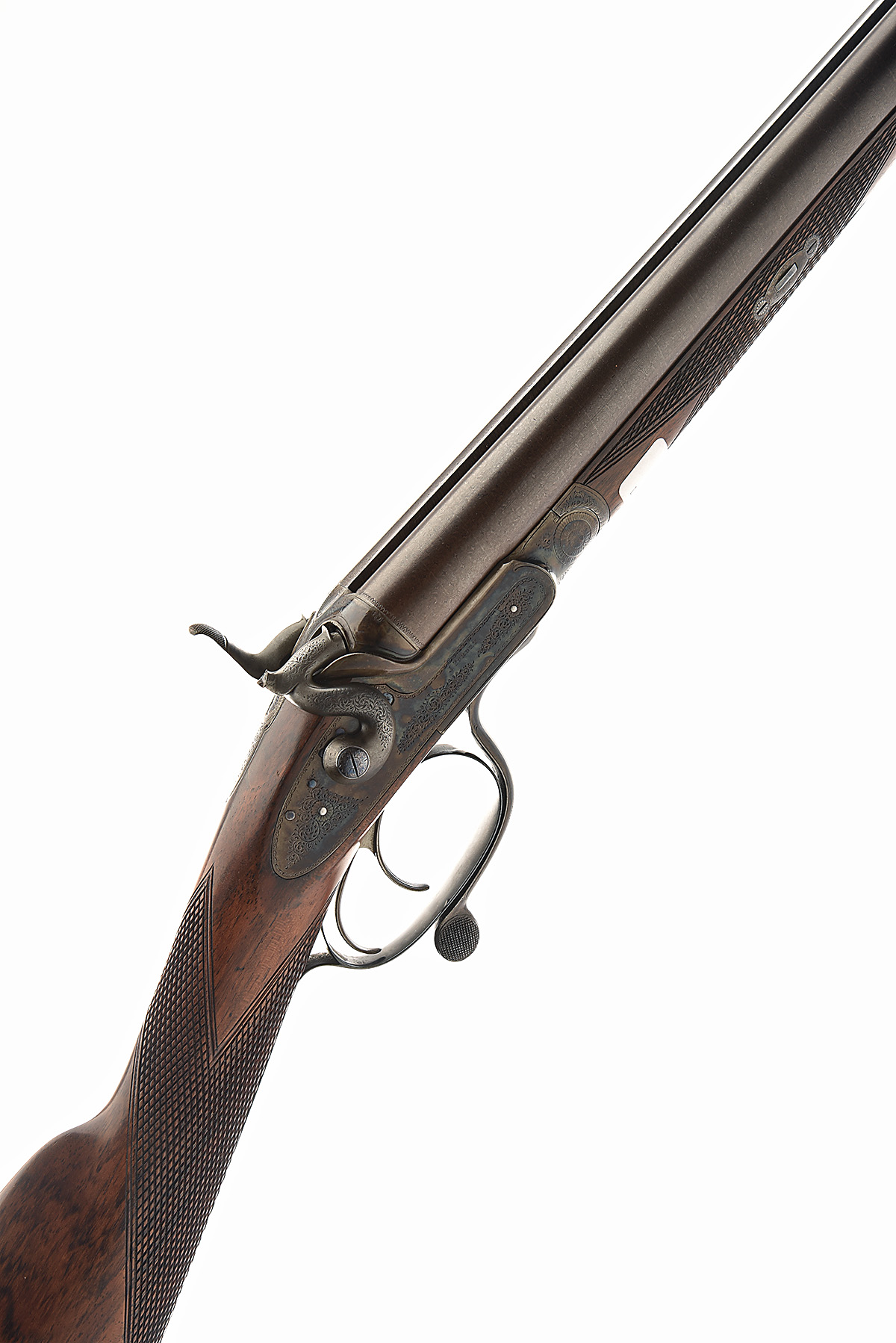 'J. PURDEY' 12-BORE ROTARY-UNDERLEVER HAMMERGUN, serial no. 5490, circa 1858, converted from muzzle-loader, 30in. black powder damascus barrels (pitted), rib spuriously engraved 'J. PURDEY & SONS. 314 1/2 OXFORD STREET. LONDON.', 2 1/2in. chambers, bored approx. true cyl. in both, Jones patent rotary underlever, carved percussion fences, non-rebounding locks (right hammer ear broken), border and partial scroll engraving, lockplates spuriously engraved 'J. PURDEY', retaining virtually full renewed colour-hardening and finish, 14 1/2in. figured replacement stock, weight 7lb., in a brass-cornered oak and leather case