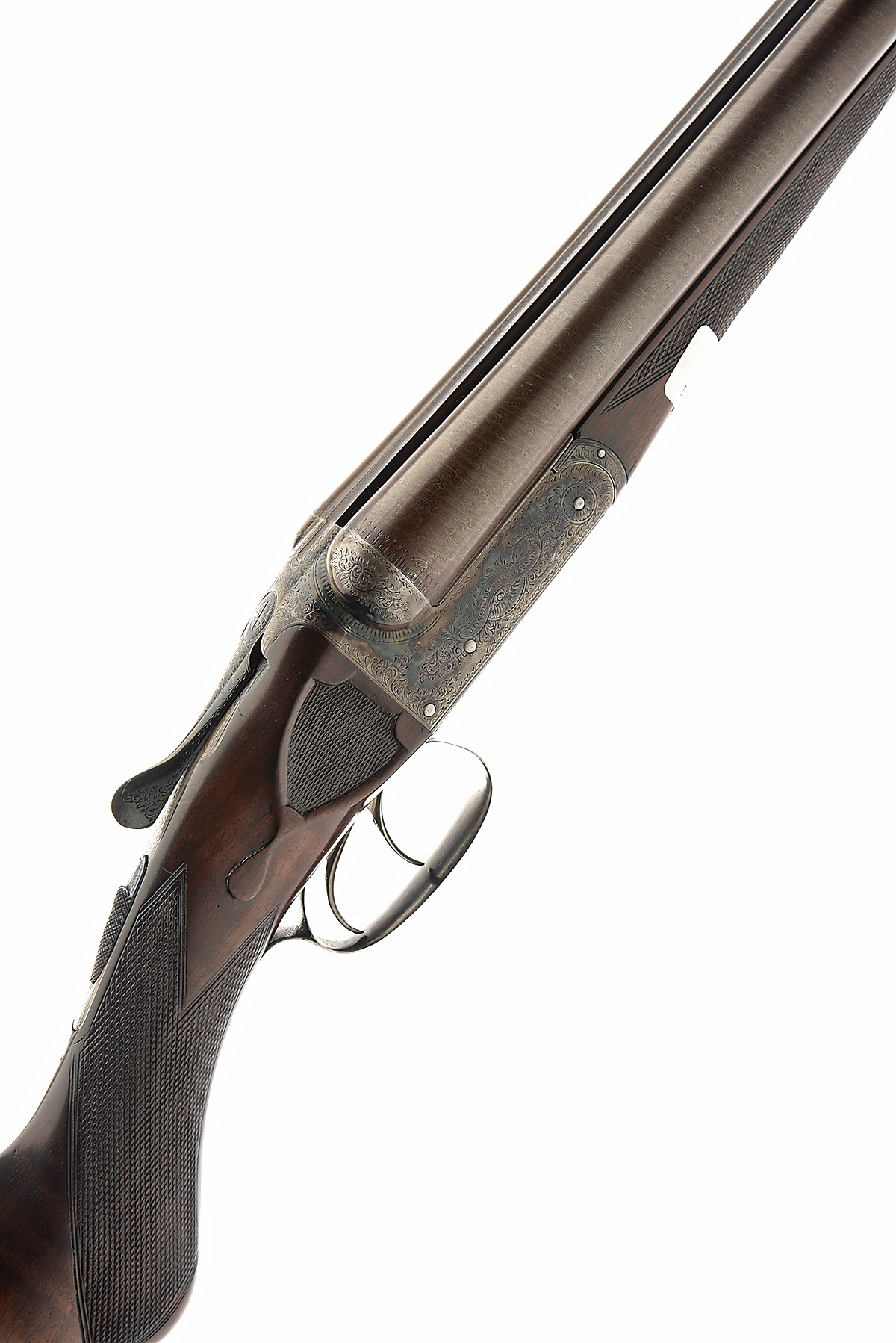 JOSEPH BOURNE & SON 12-BORE 'THE RAJH' BOXLOCK EJECTOR, serial no. 23731, circa 1900, 30in. nitro reproved damascus barrels, rib engraved 'JOSEPH BOURNE & SON. BIRMINGHAM.' and tubes engraved 'THE RAJH', 2 3/4in. chambers, bored approx. true cyl. and 1/4 choke, treble-grip action, automatic safety, border and acanthus scroll engraving, retaining much colour-hardening, 14 1/4in. figured semi-pistolgrip stock with chequered recessed side panels, steel heel and toe plates, weight 6lb. 15oz., fore-end wood split