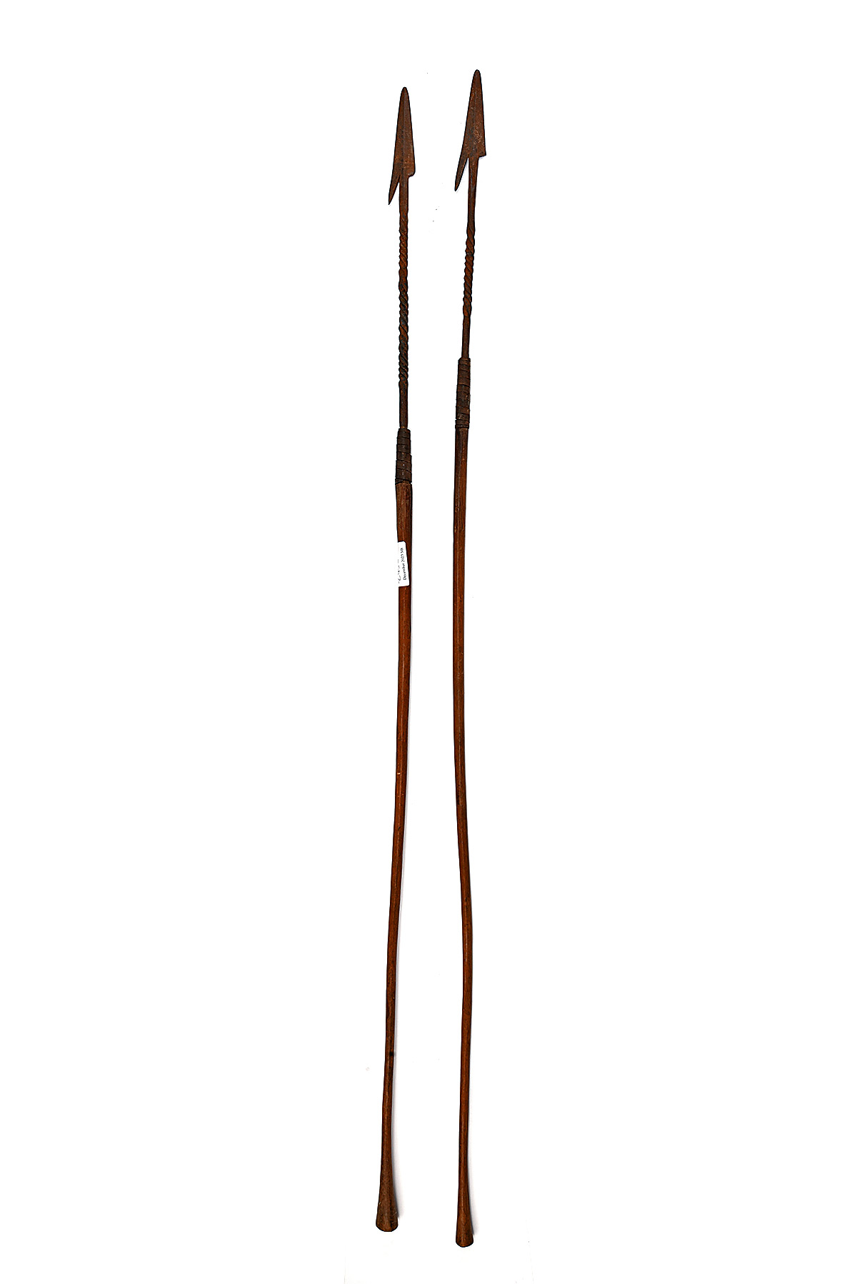 A PAIR OF AFRICAN FISHING SPEARS late 19th Century, probably Zulu as tang-mounted hand forged flattened steel blades, 5 in. with barbed on each edge, shafts with twists. mounted with spiralled steel strips to wooden hafts with hand-shaped flared terminals, surface rust, one barb missing from each blade, some splitting to hafts. each 48 in. overall