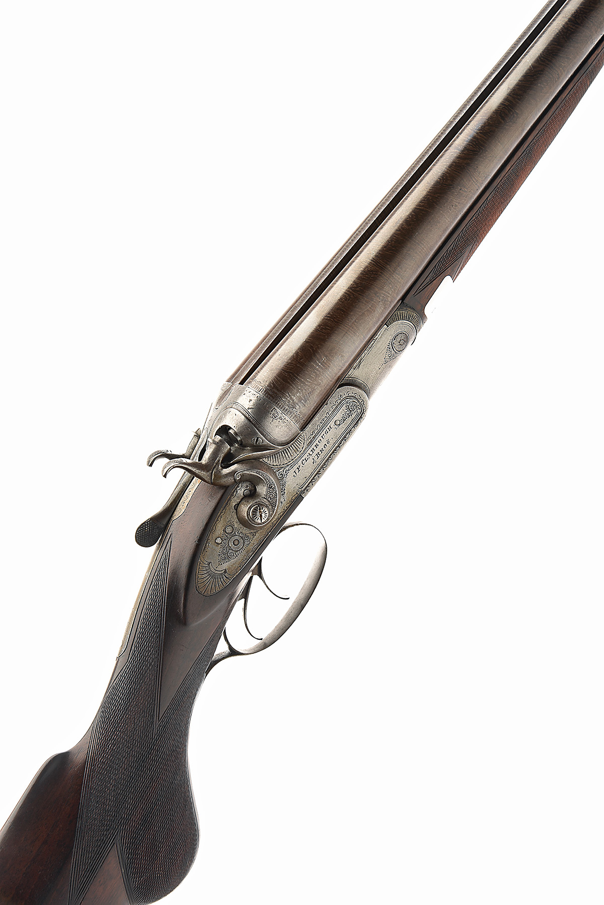 J.P. CLABROUGH & BROS. 10-BORE (3IN.) TOPLEVER HAMMERGUN, n.v.s.n., circa 1880, 32in. nitro reproved damascus barrels, 3in. chambers, bored approx. full choke in both, treble-grip action, carved percussion fences, rebounding locks, 14 1/4in. semi-pistolgrip stock including buttplate, weight 9lb. 9oz.