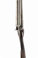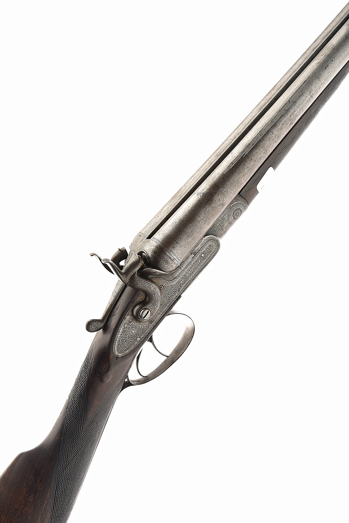 J. MACNAUGHTON 12-BORE TOPLEVER HAMMERGUN, serial no. 621, circa 1895, 30in. nitro reproved damascus barrels (in 2003, partially struck off), 2 3/4in. chambers, bored approx. true cyl. in both, carved percussion fences with broad strikers, rebounding locks, border and acanthus scroll engraving, 14 1/2in. stock (crack at hand), fore-end missing finial, weight 6lb. 13oz.