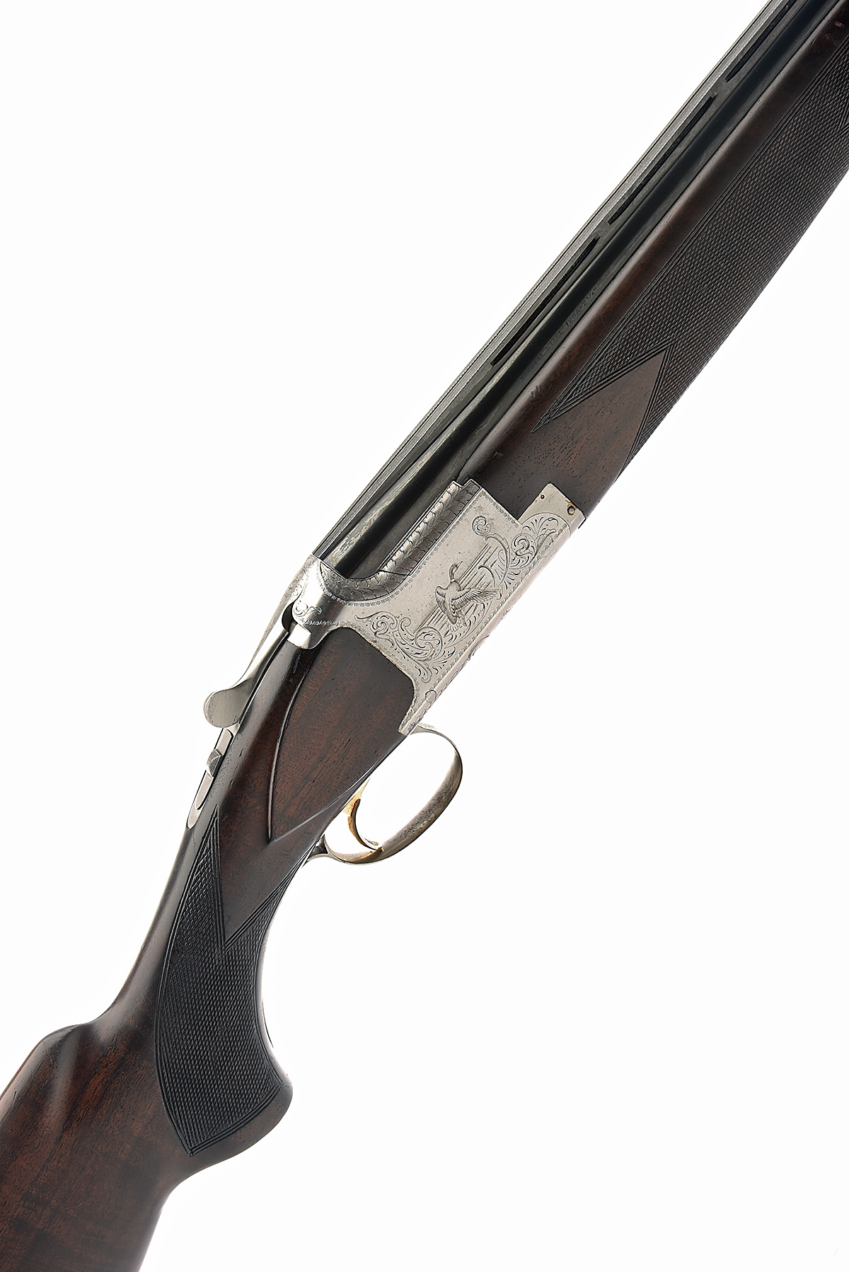 BROWNING ARMY COMPANY 12-BORE SINGLE-TRIGGER OVER AND UNDER EJECTOR, serial no. 252PX20633, dated 1983, 28in. nitro barrels with 12mm ventilated matt top-rib, 2 3/4in. chambers, multichokes (no spares), hold-open toplever, manual safety with integral barrel selector switch, gold-washed single trigger, border and partial acanthus scroll engraving surrounding scenes of pheasant and fowl, signed 'G. Marechal', brushed finish, 14 1/4in. pistolgrip stock including buttplate, weight 7lb. 8oz.