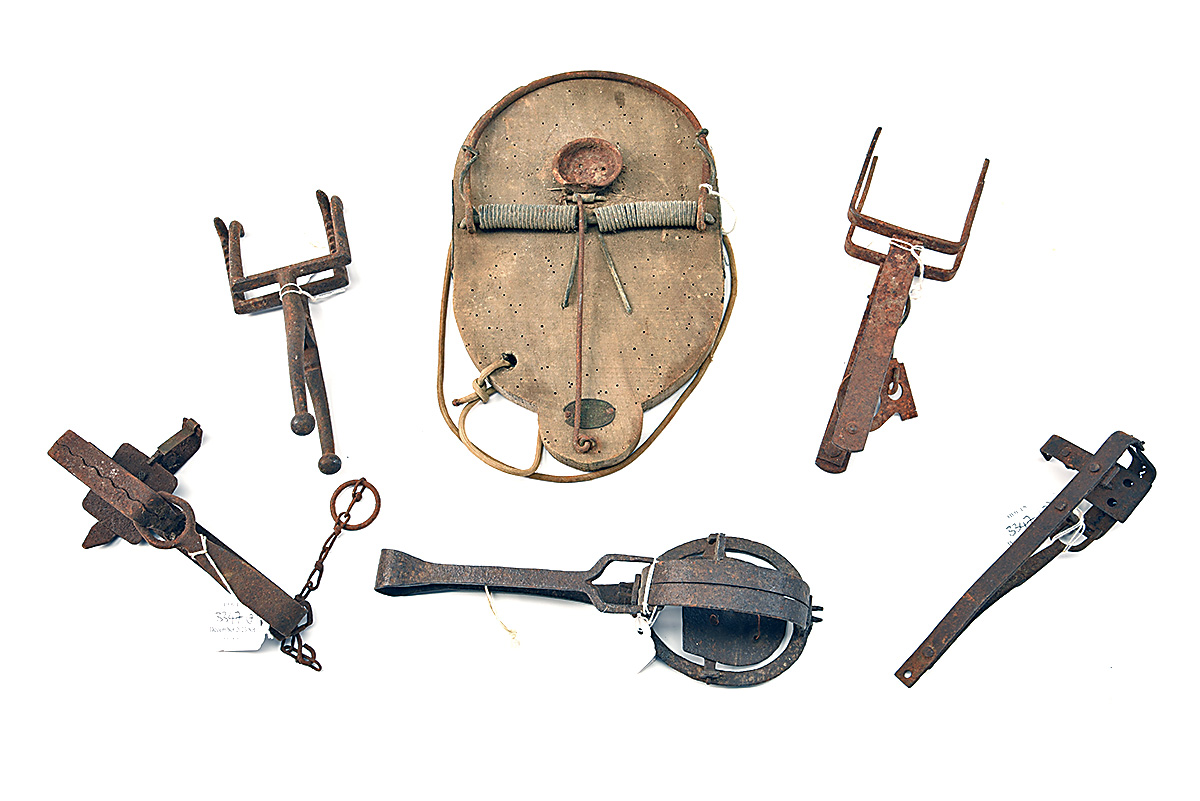SEVEN VINTAGE VARIOUS TRAPS, comprising of pole traps, gin traps