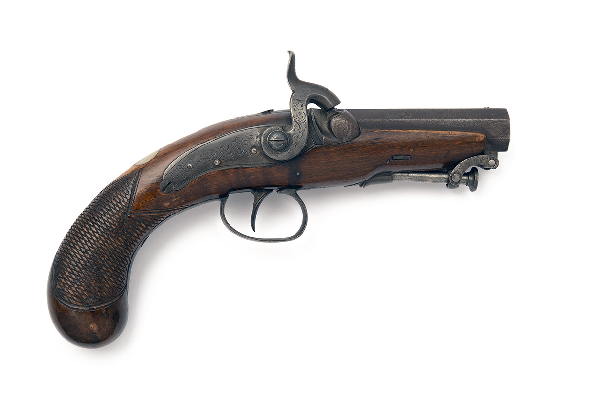 circa 1850, with 3 1/2in. octagonal barrel, bead fore-sight, scroll engraved top-tang, borderline and scroll engraved strongly curved back-action lock, engraved side-hammer, walnut full-stock with chequered bag-shaped butt, iron furniture including belt-hook mounted to the left hand side and captive stirrup ramrod