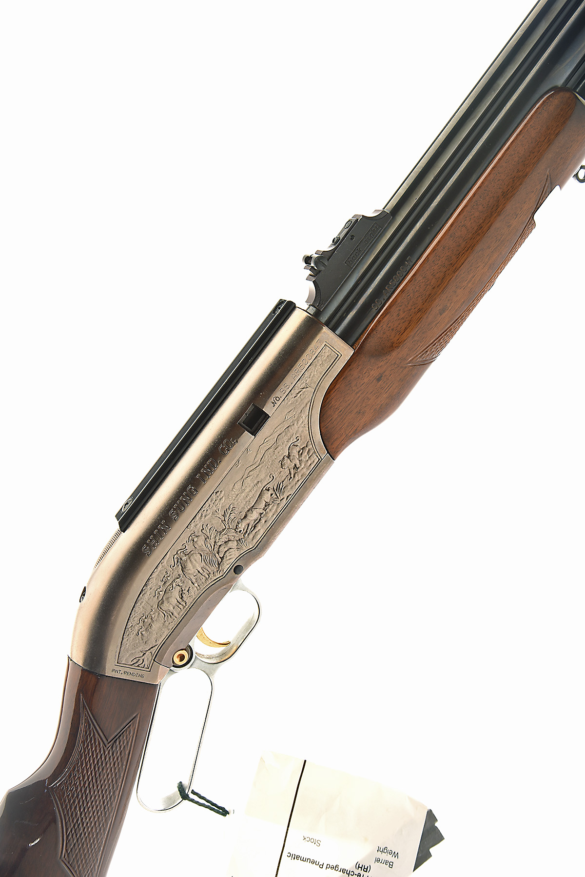 AN FAC-RATED SHINSUNG CAREER 707-5 .22 PRE-CHARGED PNEUMATIC LEVER-ACTION AIR-RIFLE, serial no. SS.AR500847, with blued 32in. barrel including detachable sound moderator, relief embossed satin chrome receiver, chequered walnut straight hand butt-stock, twin under-barrel air reservoirs and chequered walnut beavertail fore-end, untested. with two magazines + moderator