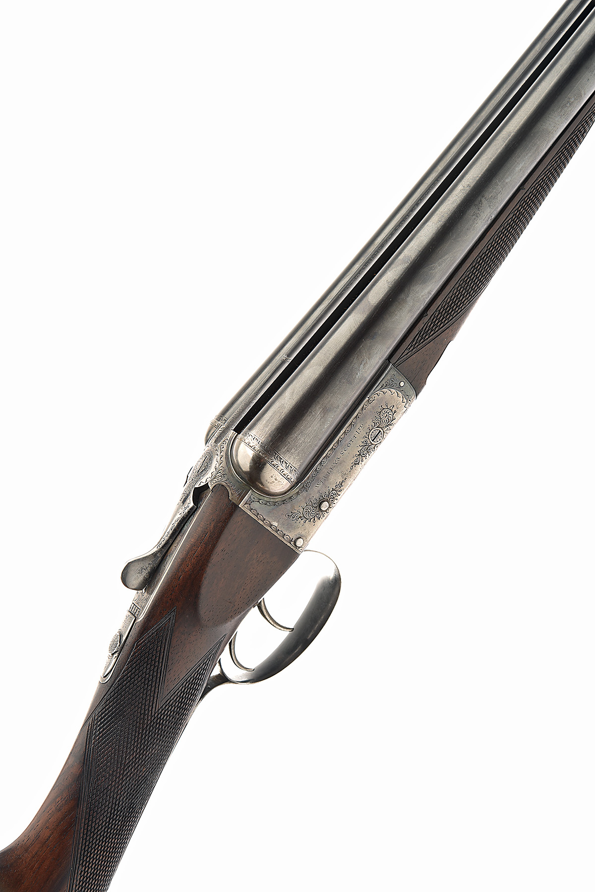WEBLEY SCOTT 12-BORE BOXLOCK EJECTOR, serial no. 76064, circa 1939, 28in. nitro reproved barrels, 2 1/2in. chambers, bored approx. 1/4 and full choke, treble-grip action with removable striker discs, automatic safety, border and scroll engraving, retaining slight traces of colour-hardening, 14 3/4in. stock (cracked through and repaired at hand)