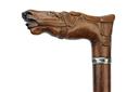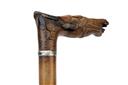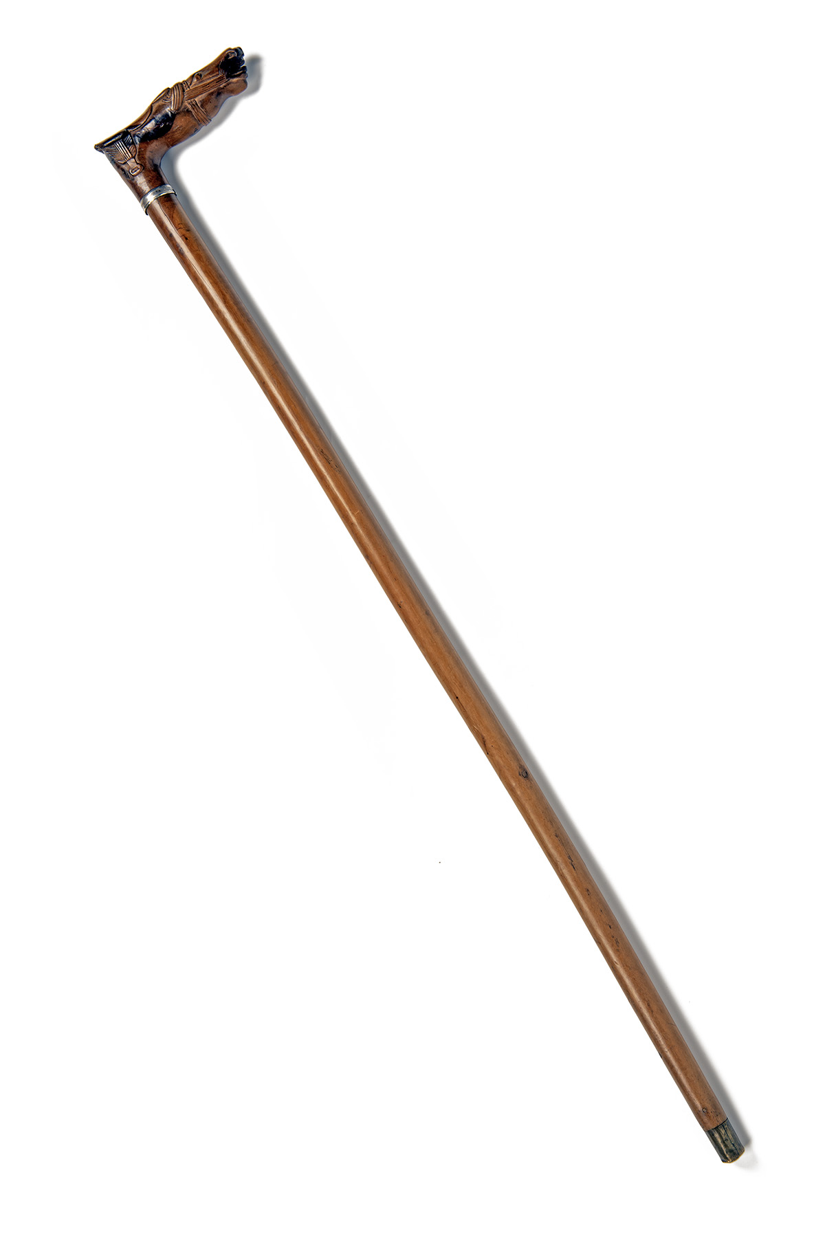 French or Belgian probably circa 1870, with blued and fluted 1 7/8in. hand-revolved six-shot barrel-group, the central axis mounted with a square-section dagger spike partially blued with flambé tongues extending towards the tip, circular action body etched with scrolled panels and with carved flush-fitting blued hammer and trigger, moulded pin-guard etched with a running band, the walnut handle carved as a stylised horse head and saddle, white metal collars to the handle and the throat of the hollow wooden stick and brass ferrule to tip