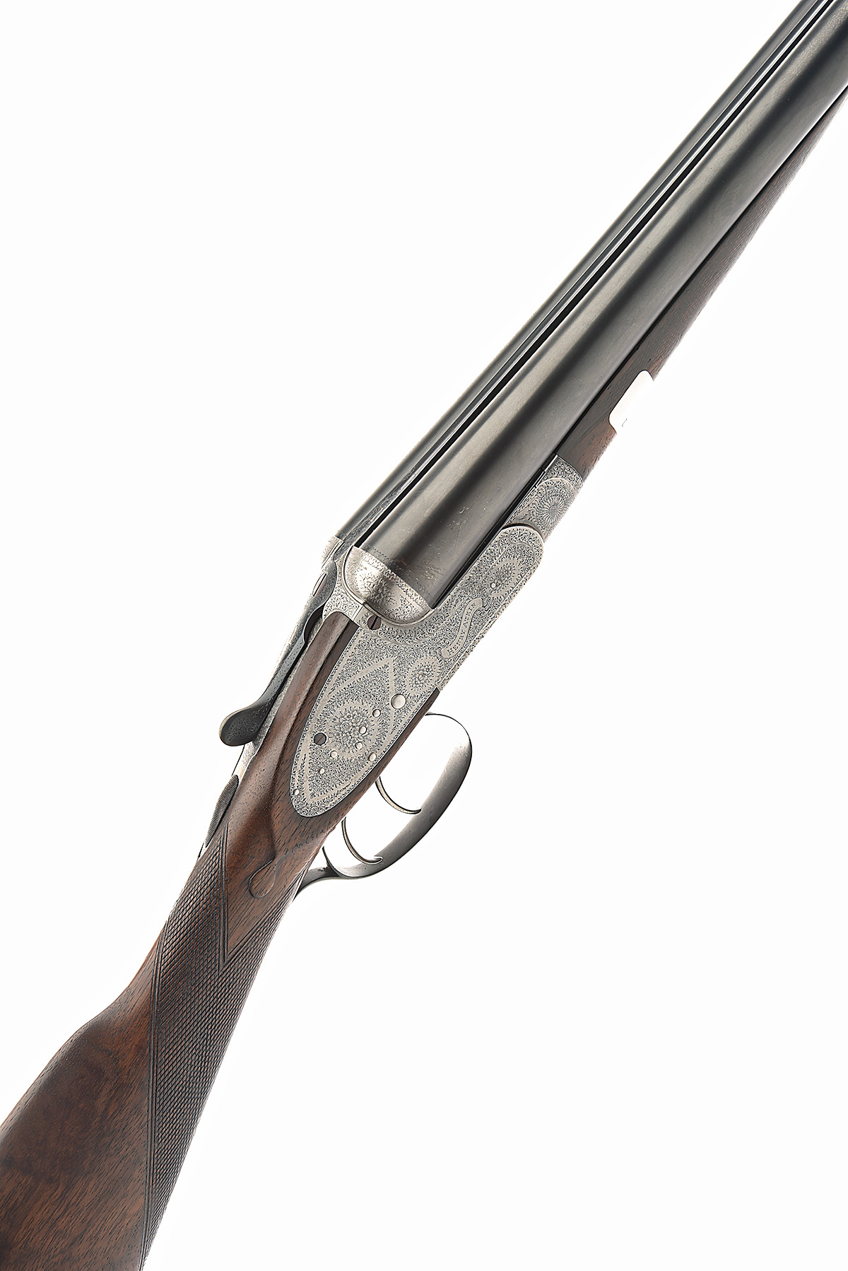 HENRY ATKIN 12-BORE SIDELOCK EJECTOR, serial no. 633, circa 1900, 28in. nitro replacement (in 1974) barrels, the rib with a gold-inlaid '1' and acanthus scroll detailing at the breech-end, the tubes engraved 'HENRY ATKIN. 7 BURY STREET. ST. JAMES'S LONDON. ENGLAND.', 2 1/2in. chambers, bored approx. 1/4 and 1/2 choke, treble-grip action, toplever gold-inlaid '1', automatic safety with gold-inlaid 'SAFE' detail, fine acanthus scroll and floral bouquet engraving, the underside engraved 'HENRY ATKIN FROM PURDEY'S', bright and reblued finish overall, 14 7/8in. figured stock including 1 1/4in. wooden extension, weight 6lb. 12oz.