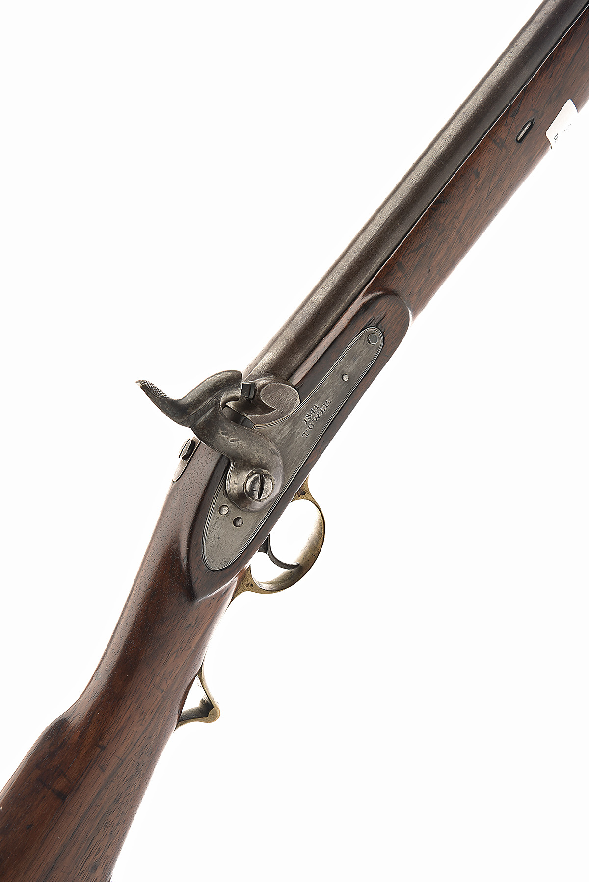 AN INTERESTING AND UNUSUAL .577 PERCUSSION PATTERN 1844 TYPE YEOMANRY CARBINE, no visible serial number, circa 1860, with 21in. barrel rifled with three grooves, blade front-sight, the breech tang incorporating a fixed U rear-sight, swivel rammer hinged at muzzle, borderline engraved side-action lock engraved ' 1844 / TOWER' to centre, probably spurious, regulation brass mounted full walnut stock, including flat style nose-cap incorporating rammer pipe, scroll trigger-guard.