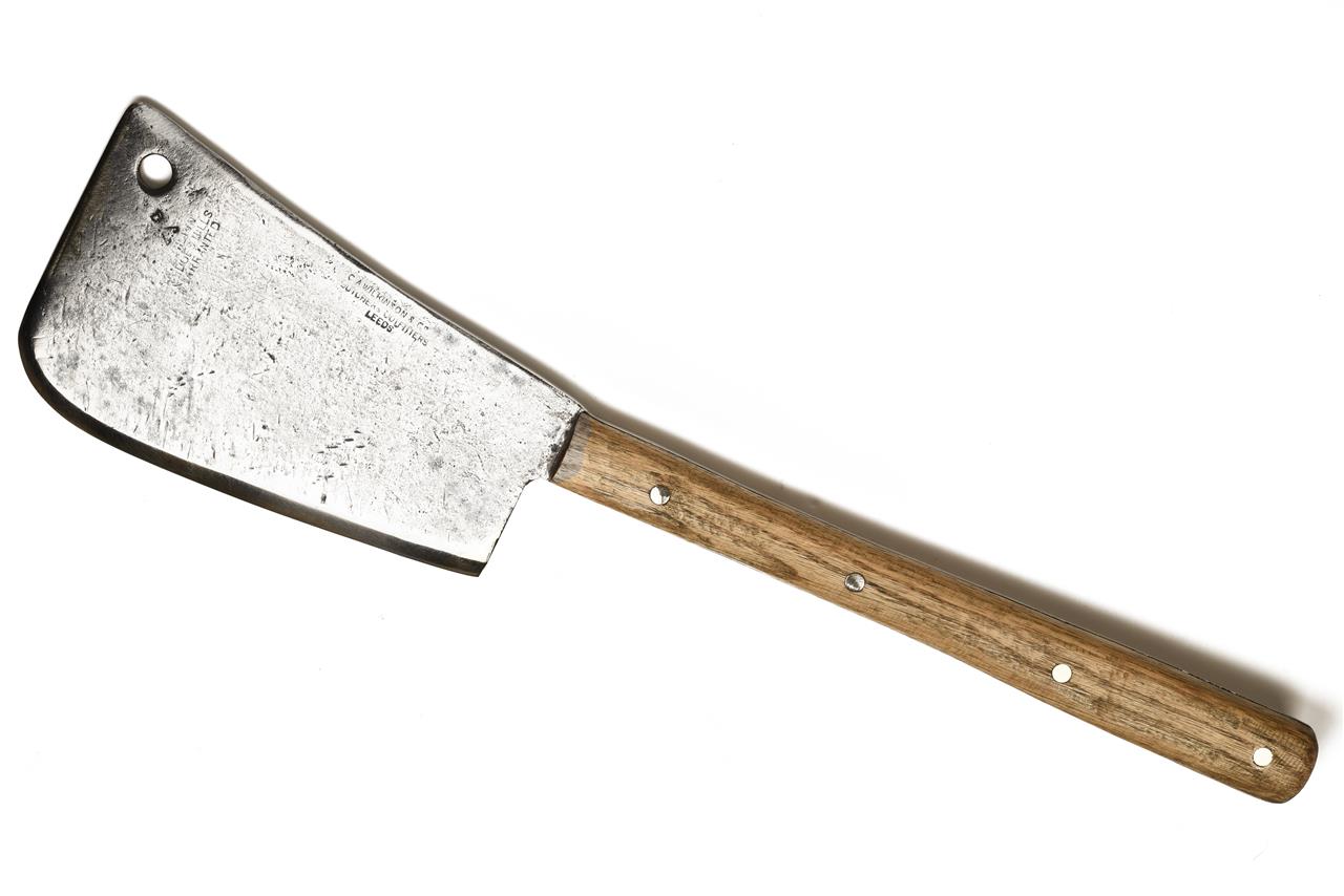 A LARGE ANTIQUE BUTCHER'S CLEAVER SIGNED C.A. WILKINSON, LEEDS, 23in. overall with offset 9in. head, the blade signed 'C.A. WILKINSON & CO, BUTCHER'S OUTFITTERS, LEEDS, the blade cleaned and edge polished, new furniture fitted