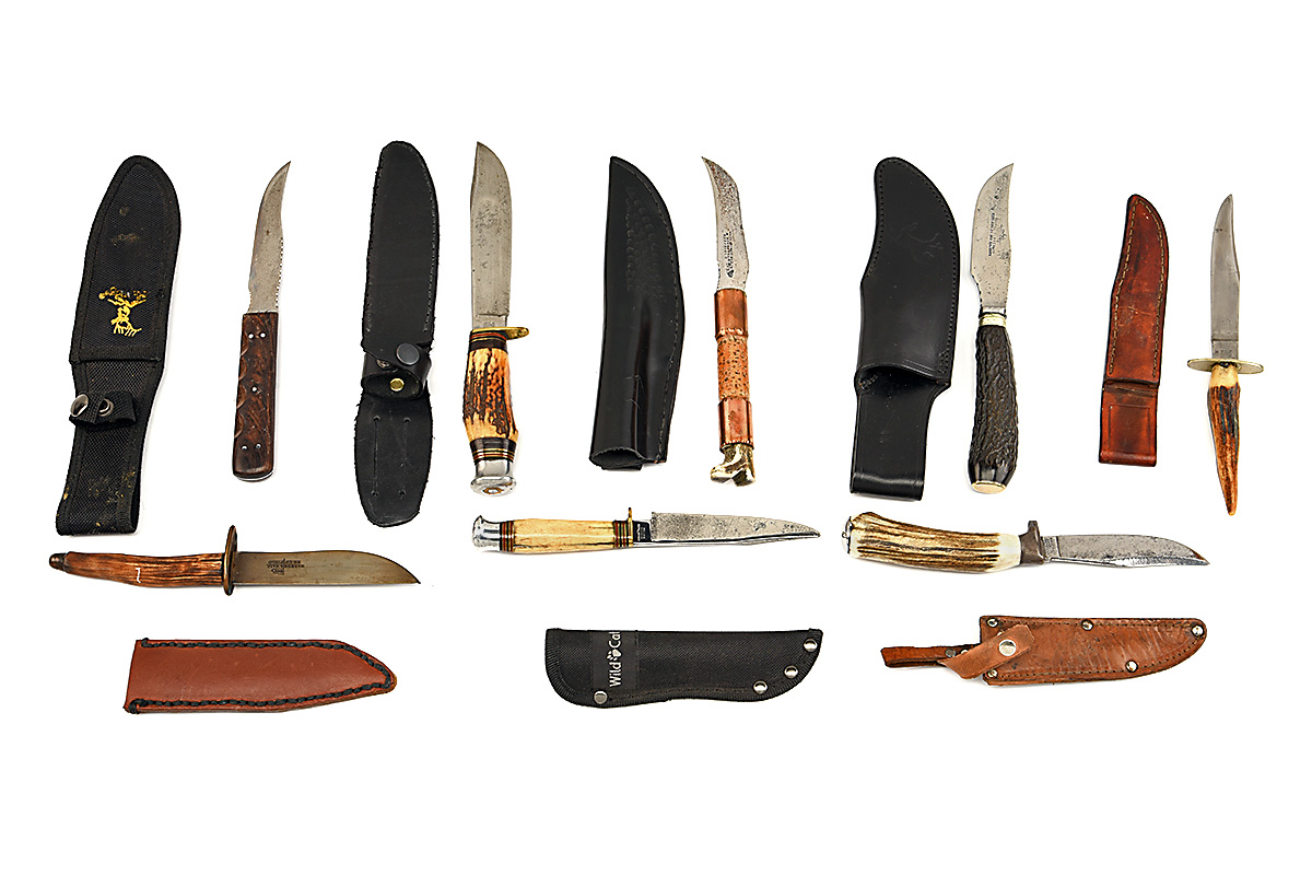 A COLLECTION OF EIGHT MOSTLY SHEFFIELD MADE VINTAGE AND ANTIQUE SHEATH KNIVES, including examples by Wade Wingfield & Robotham, Thomas Turner & Co., William Rodgers, Walker & hall, Malehams & Yeoman and others, all with scabbard but most married