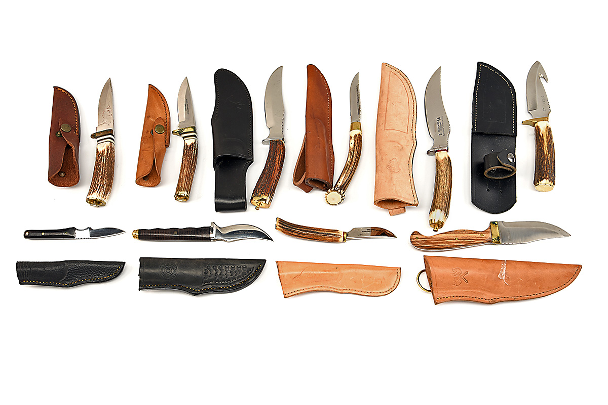 TEN ASSORTED SPORTING SHEATH KNIVES, mostly English, all with leather scabbards, some storage staining
