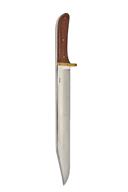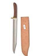 A VERY LARGE BOWIE-KNIFE SIGNED HARRY BODEN, Sheffield, with 15in. blade, brass cross-guard and smooth wood grip, in its leather sheath