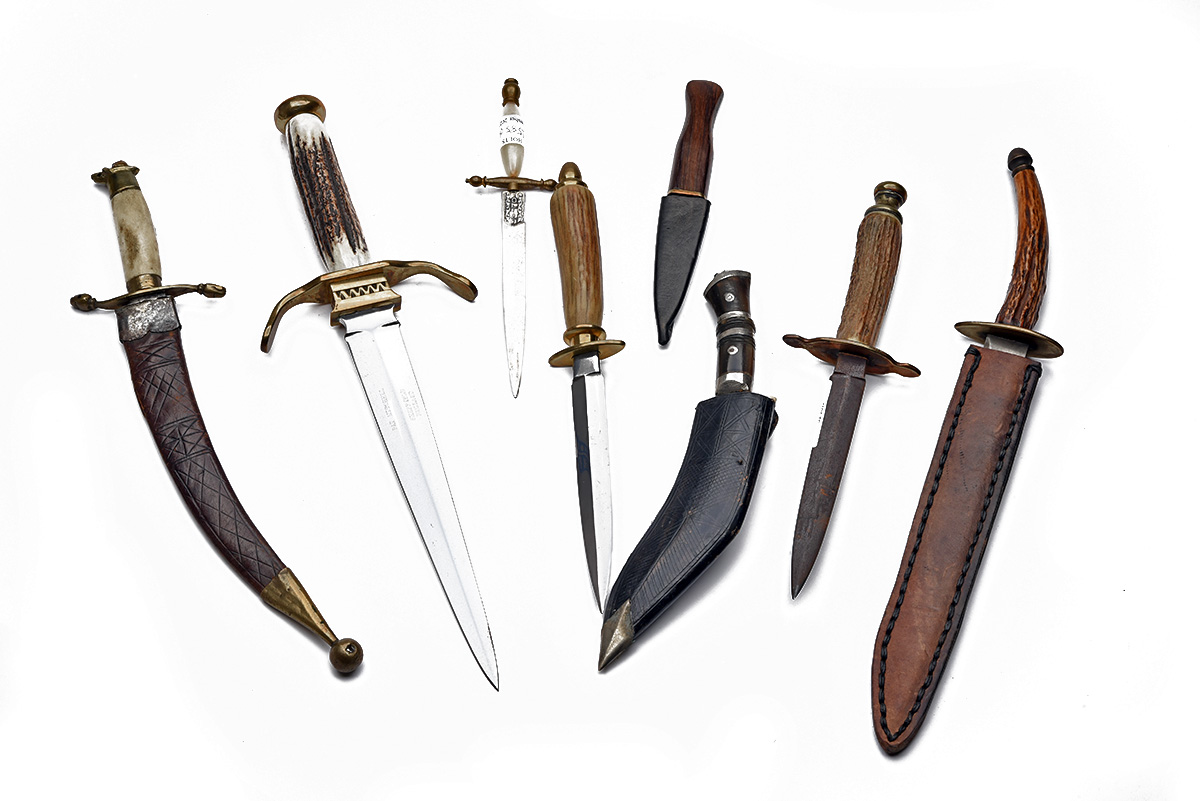 A GROUP OF EIGHT ASSORTED DAGGERS AND KNIVES, including one large stiletto dagger signed 'Pat Mitchell' (possibly spurious, no scabbard), three further stilettoes without scabbards, a bone handled Moroccan knife, a small tourist kukri, a Skein Dubh signed J. Nowill and a stag-handled knife with 9 1/2in. blade signed 'Laguiole', all the latter with scabbards