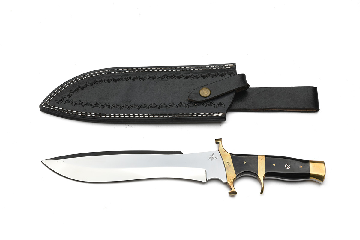 A SPORTING SHEATH KNIFE AND A VINTAGE STYLE BOWIE MARKED TO THE 1964 OLYMPICS, the first with fullered 8in. blade and finger-spurred horn grip with brass furniture, the second of vintage style with wood finger scalloped grips, the 9 1/2in. blade etched 'OLYMPIC GAMES TOKYO 1964' together with 'MARY RAND', 'ANN PACKER', 'KEN MATTHEWS' and 'LYNN DAVIES' flanking two Olympic torches either side of a circle around the wording 'GOLD MEDALS', both with scabbards