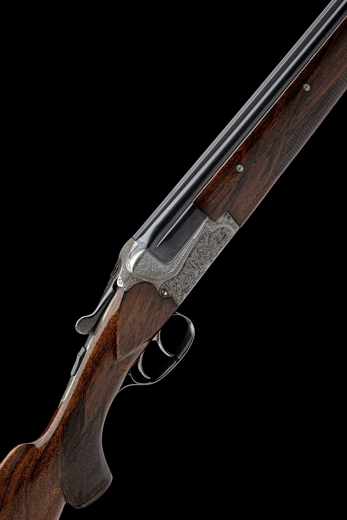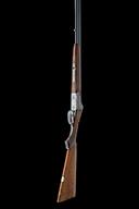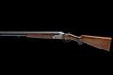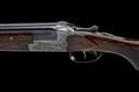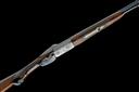 dated 1981, 26 3/4in. nitro reproved barrels with solid 8mm matt top-rib, three-piece fore-end with wooden side-fillets, 3in. chambers, bored approx. 1/2 and 3/4 choke, scroll-back action with side-bolsters, hold-open toplever, pin cocking-indicators, articulated front trigger, Germanic scroll engraving surrounding carved game scenes of hound and fowl, 15in. pistolgrip stock including 3/4in. wooden extension, weight 6lb. 5oz.
