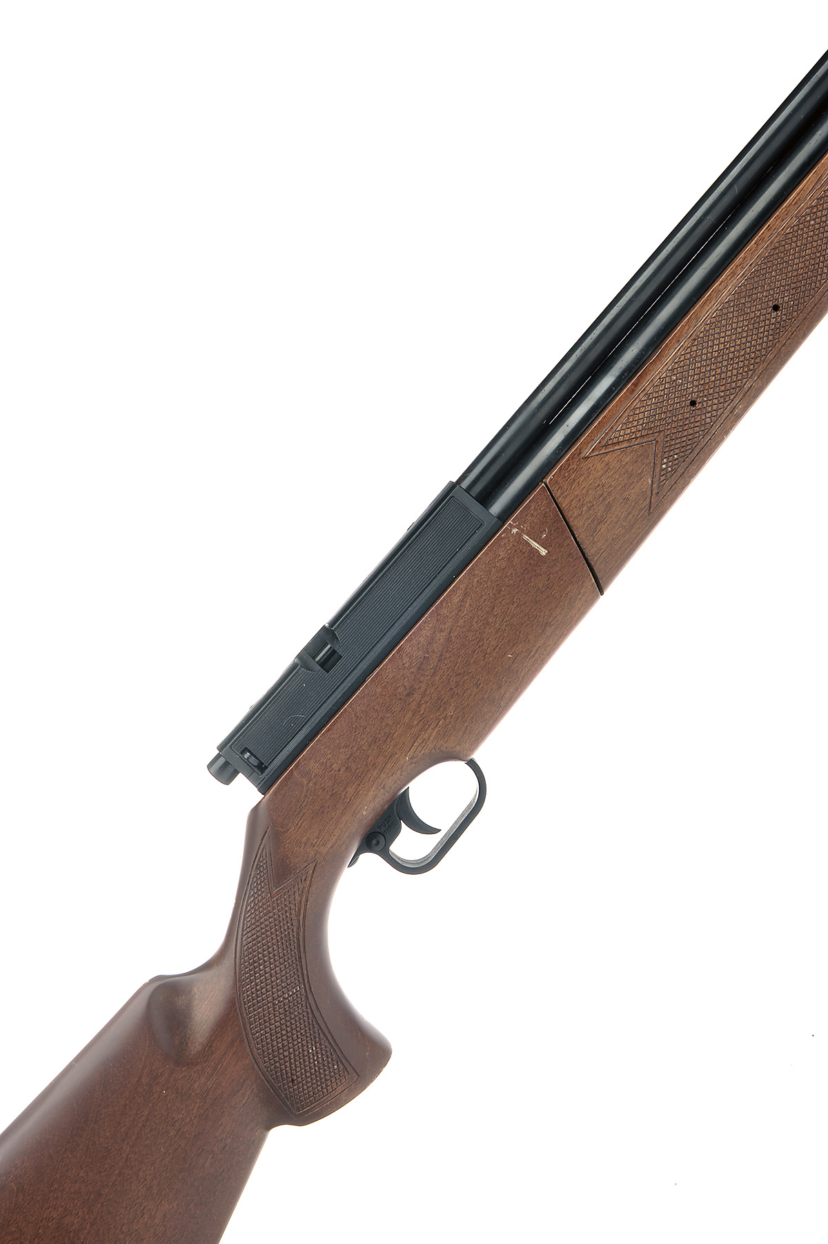 A SCARCE .177 MULTI-PUMP PNEUMATIC AIR-RIFLE SIGNED SHARP, MODEL 'TIGER', serial no. B76520, with plastic shrouded 29in. barrel including detachable sound-moderator, moulded plastic receiver railed for a telescopic sight, chequered walnut butt-stock and chequered walnut pump-handle