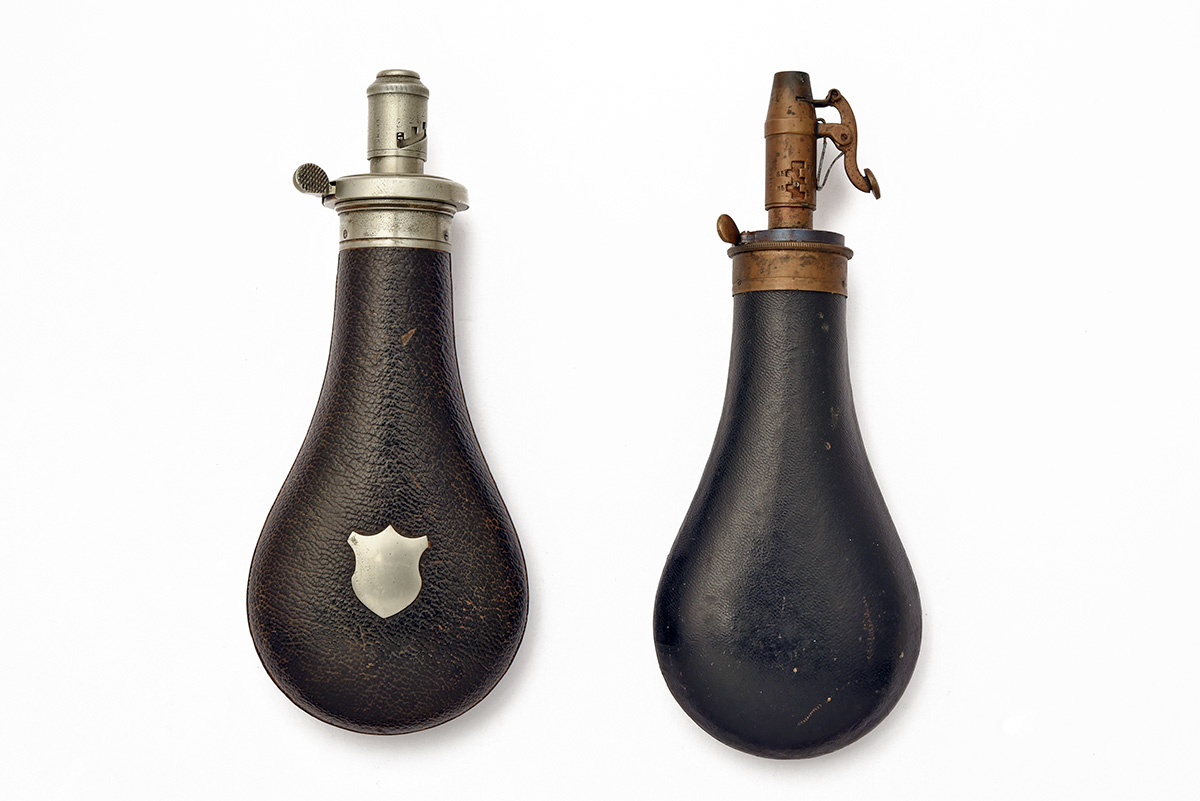 A PAIR OF BETTER POWDER FLASKS FOR SPORTING GUNS BY DIXON, circa mid-19th Century, bag-shaped with black pig-skin leather, 1) nickel-steel cap with graduated spout, base marked 'JAMES DIXON / & SONS / SHEFFIELD', together with the Victorian registered design kite mark, blank white metal shield escutcheon; 2) brass cap with graduated and sprung spout, base marked 'JAMES DIXON / & SONS Ltd / SHEFFIELD' and 'PARKER HALE Ltd / BIRMINGHAM, ENGLAND'; both fully working and 8 1/2 in. overall