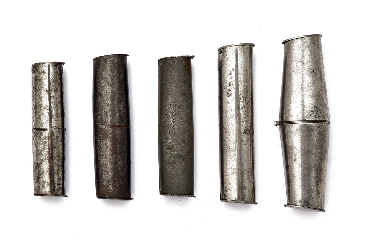A GROUP OF FIVE MIXED STEEL DOUBLE-ENDED SHOT CHARGERS,