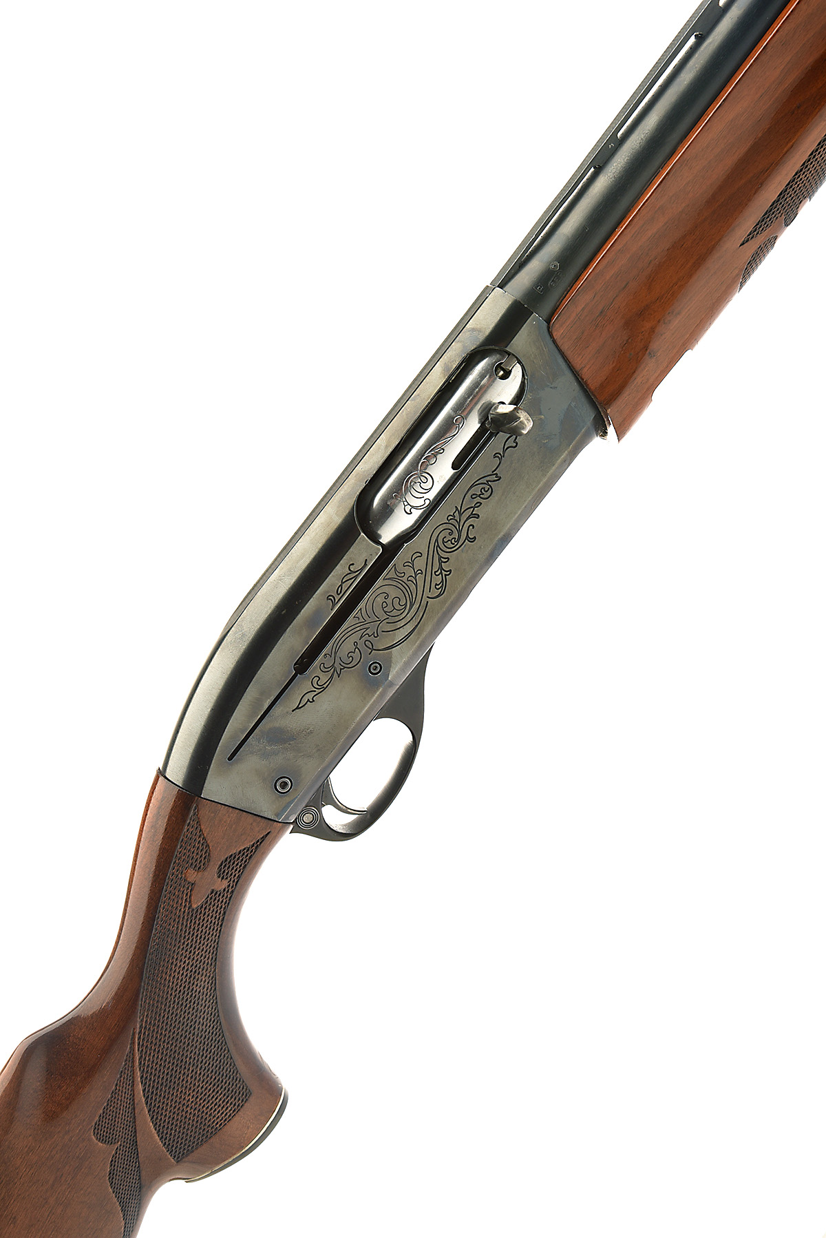 AN F.A.C. REMINGTON 12-BORE 'MODEL 1100' SEMI-AUTO SHOTGUN, serial no. M213433V, circa 1975, 25 1/2in. nitro barrel including cutts compensator, with 8mm ventilated matt rib, 2 3/4in. chamber, multichoke (with spares), manual push-button safety, blacked action with acanthus scroll engraving, 14 1/2in. ornately chequered pistolgrip stock including ventilated rubber recoil pad