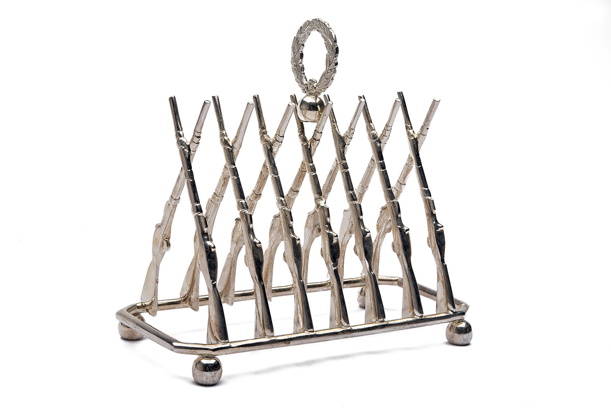 A LARGE SILVER TOAST RACK IN THE FORM OF CROSSED GUNS,