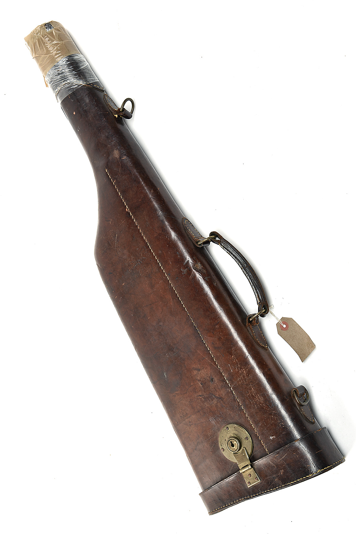 A LEATHER SINGLE LEG OF MUTTON GUNCASE fitted for 31in. barrels, the interior lined with green baize, brass lock (key missing), bottom needs repair