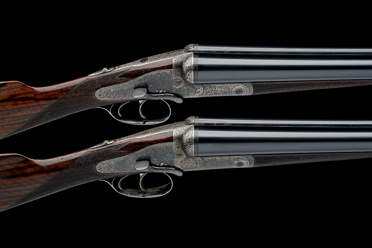 circa 1898, 28in. Whitworth-steel nitro chopperlump barrels, the ribs engraved 'J. BLANCH & SON. 29 GRACECHURCH STREET. LONDON', 'MADE OF SIR JOSEPH WHITWORTH'S FLUID PRESSED STEEL' and '1' and '2' at the breech ends, 2 1/2in. chambers, bored approx. true cyl. and 1/2 choke, treble-grip actions with gas checks, automatic safeties with gold-inlaid 'SAFE' details, gold-inlaid cocking-indicators, profusely engraved with bold acanthus scrollwork with ornate bordering, the triggerguards incorporating '1' and '2', retaining traces of colour-hardening, minor chip to No.2 knuckle, 14 3/4in. figured stocks including buttplates, fore-ends with 'J. BLANCH & SON'S IMPROVED SNAP BOLT' lever releases, weight 6lb. 9oz.