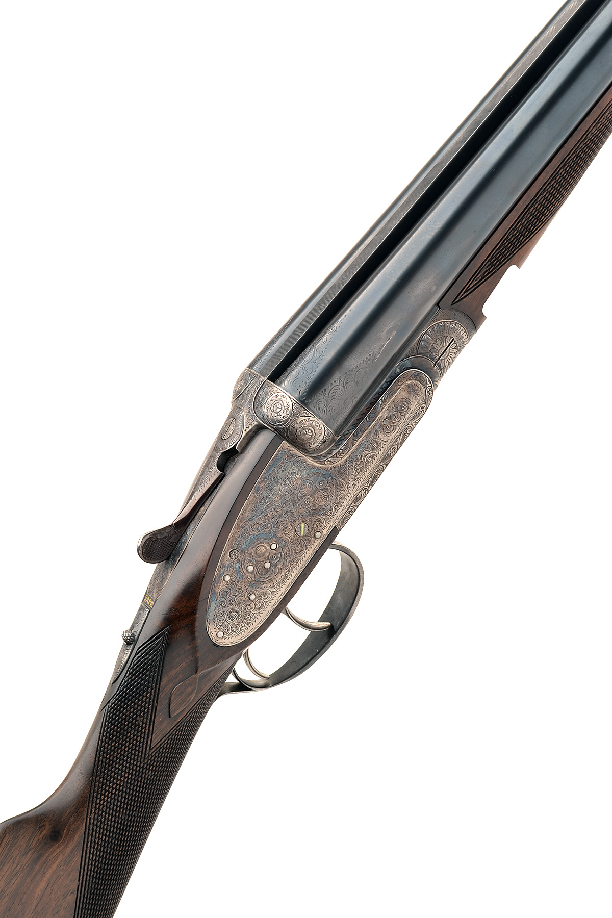MENDI 12-BORE HAND-DETACHABLE SIDELOCK EJECTOR, serial no. 16777, 26 3/4in. nitro chopperlump barrels, the tubes engraved with flashes of scrollwork at the breech end, 2 3/4in. chambers, bored approx. imp. cyl. and 1/2 choke, removable striker discs, automatic safety with gold-inlaid 'SAFE' detail, gold-inlaid cocking indicators, articulated front trigger, hand detachable lockplates, bouquet and scroll engraving, retaining traces of original colour-hardening and finish14 3/4in. stock including 1in. rubber recoil pad (some setting cracks), weight 6lb. 13oz.