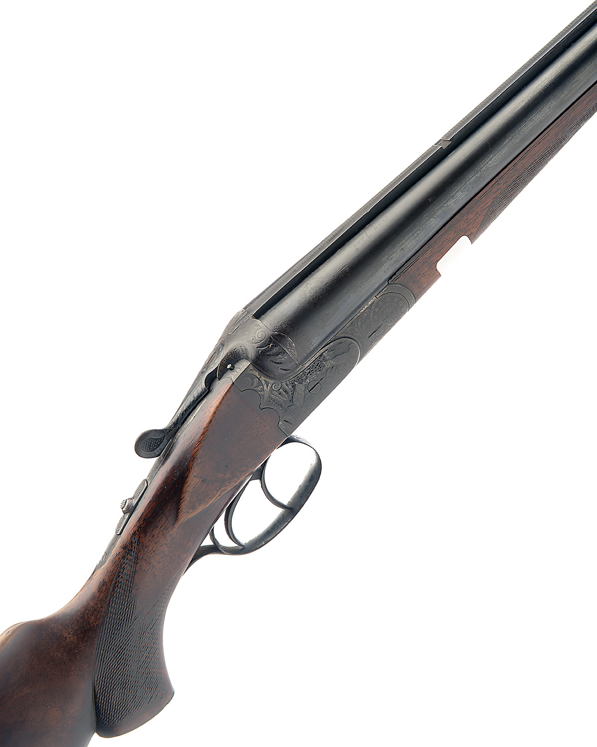 AUG. JUNG (VIERNAU) 12-BORE BOXLOCK NON-EJECTOR, serial no. 5846, 27 3/4in. nitro reproved barrels, 2 3/4in. chambers, bored approx. 3/4 and full choke, scroll-back sideclipped treble-grip action, manual safety, cocking indicator studs, carved with game scenes, 14 1/2in. pistolgrip stock with cheekpiece, sling swivels, including 1in. extension