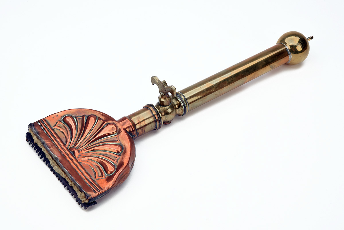 A HORSE HAIR GROOMING AND SINGEING TOOL BY T.E. BLADDON, dated 1940, copper and brass, tooth bar stamped 'T.E. BLADDON / & SON Ltd. / B'HAM / 1940', brass tap on the handle controls the flow of hot water from the reservoir, both head and handle unscrew, some denting to the copper head, 14 1/2 in. length