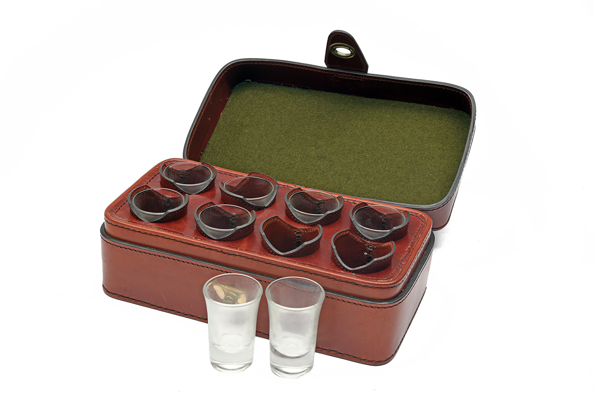 REY PAVON AN UNUSED LEATHER CASED SET OF EIGHT SHOT GLASSES,