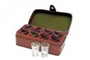 AN UNUSED LEATHER CASED SET OF EIGHT SHOT GLASSES,