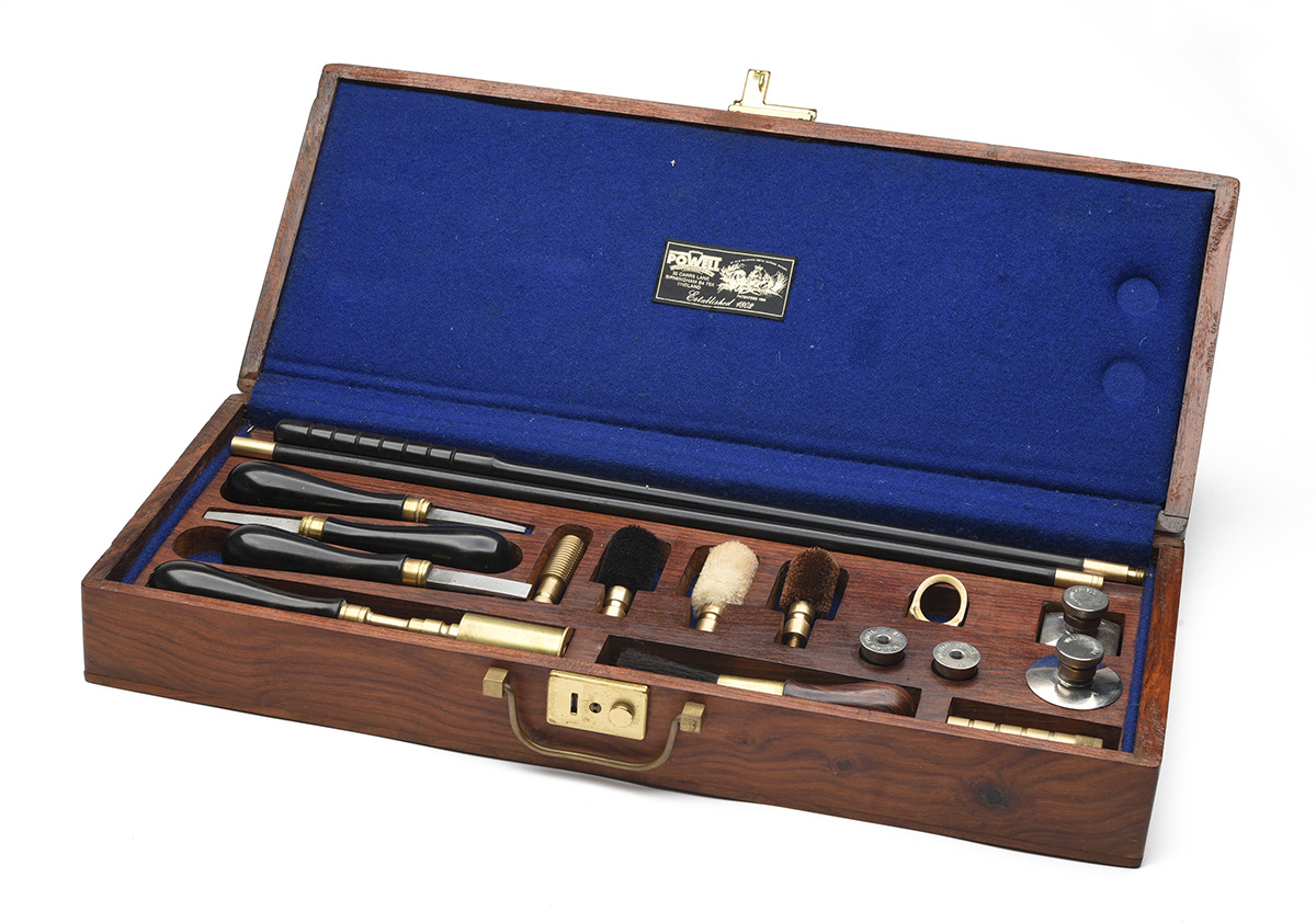 fitted partitioned tray lined with green baize, with separate compartments containing turnscrews, cleaning rod and heads, chamber brush, nickel-plated oil bottles, extractor ring and snap caps, brass lock, brass fittings, applied William Powell trade label