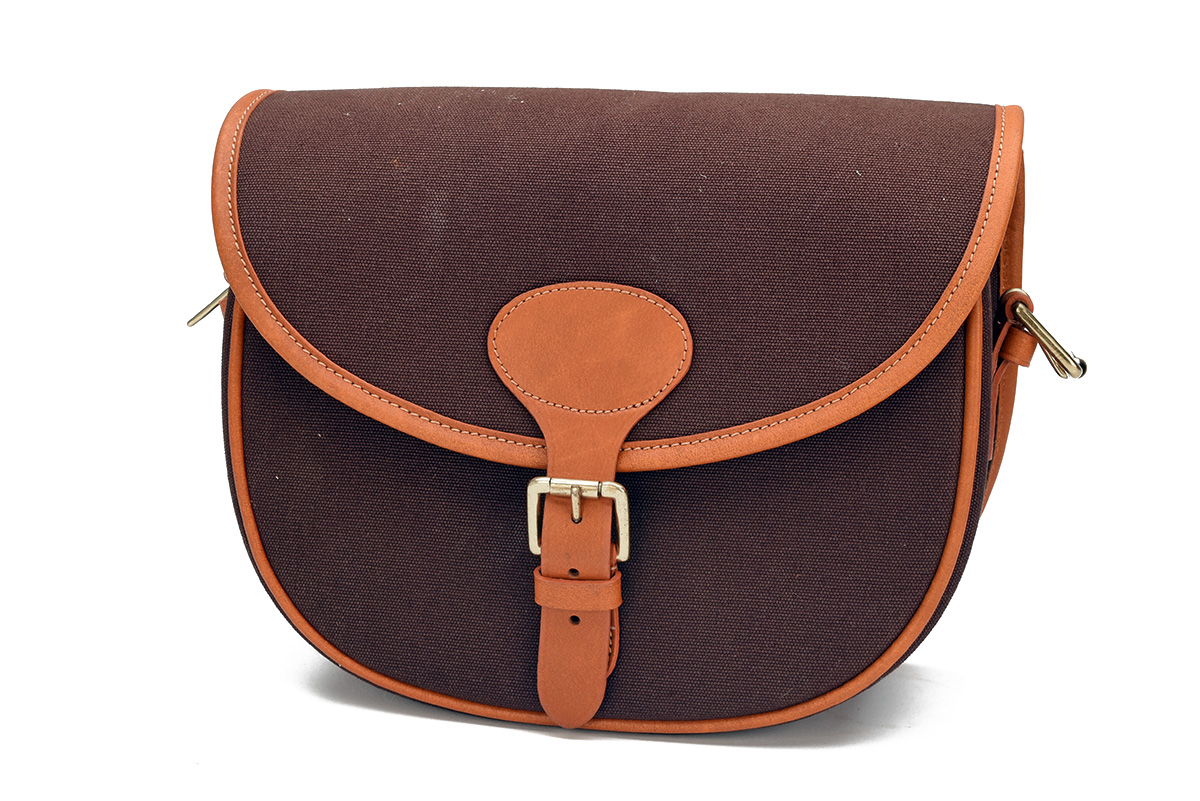 AN UNUSED COLEMAN BAINES FOX BROWN CANVAS AND LEATHER CARTRIDGE BAG,