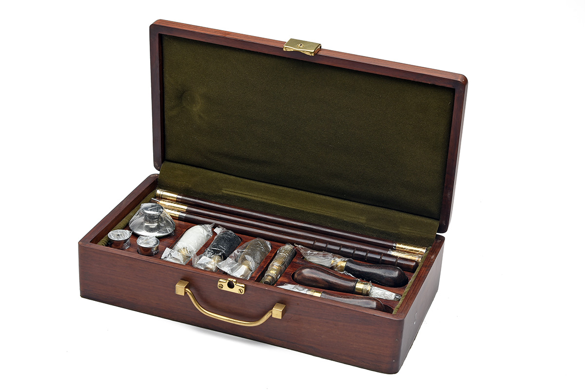 fitted partitioned tray with separate compartments containing turnscrews, cleaning rod and heads, nickel-plated oil bottle and snap-caps, brass lock, brass fittings and lined with green baize