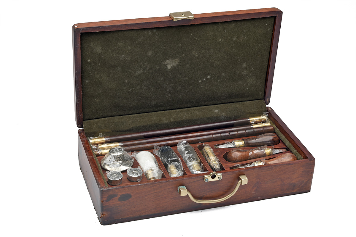 AN UNUSED PRESENTATION DELUXE GUN ACCESSORY AND CLEANING KIT, fitted partitioned tray with separate compartments containing turnscrews, cleaning rod and heads, nickel-plated oil bottle, snap-caps, brass lock, brass fittings and lined with green baize