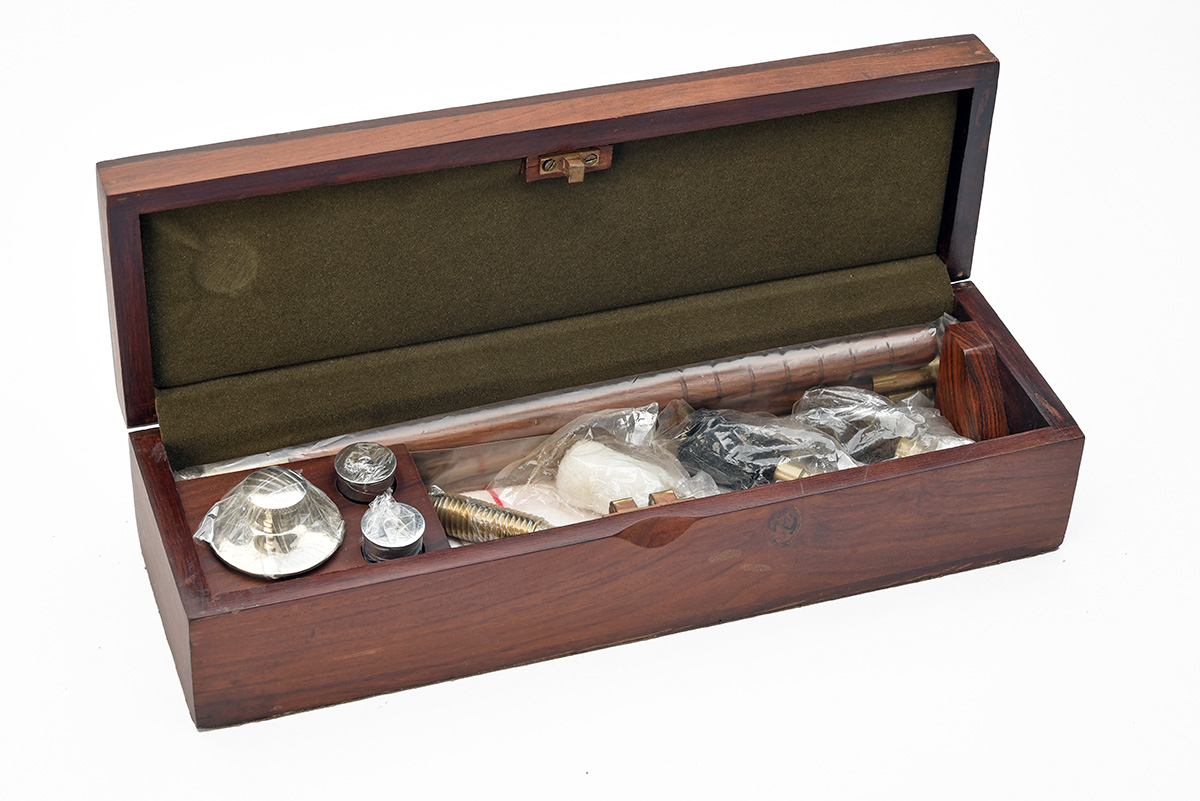 AN UNUSED MAHOGANY PRESENTATION 12-BORE GUN CLEANING KIT,
