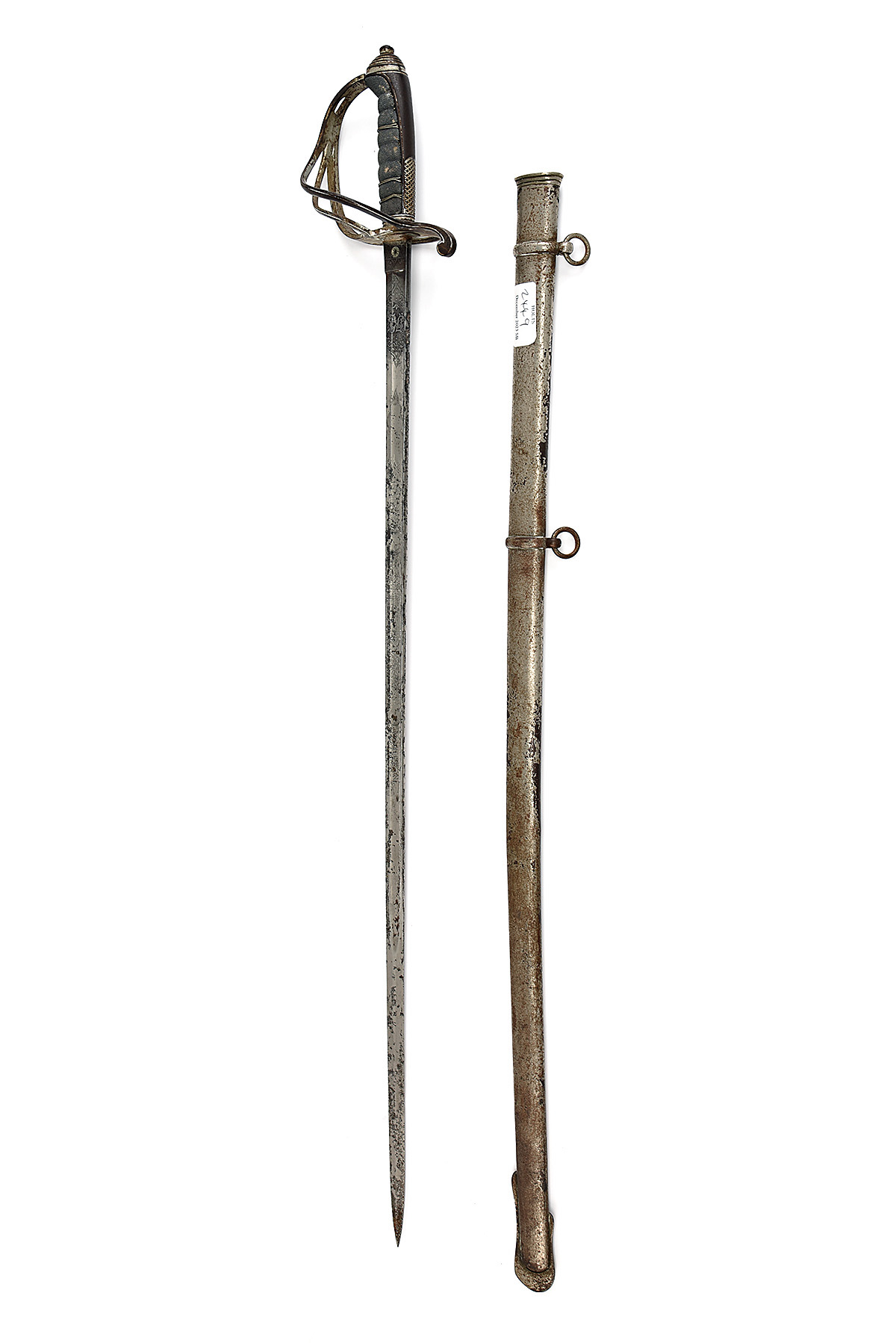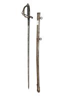 A PATTERN 1827 ARTILLERY OFFICER'S DRESS SWORD FROM THE CHESHIRE & CARNARVON ARTILLERY VOLUNTEERS, late 19th Century, with 30 3/4 in. single-edged blade fullered on each side, etched with scroll-work and artillery symbols, plus unit details to one side and monogram ricasso marked 'HOBSON / & SONS / LITTLE / WIND MILL St / LONDON', with proved plug over, 3-barred guard, wire-bound fish-skin grip, together with its steel scabbard. worn, all metalwork tarnished, scabbard dented, losses to grip wire, this unit existed from 1880 to 1902, 39 in. overall