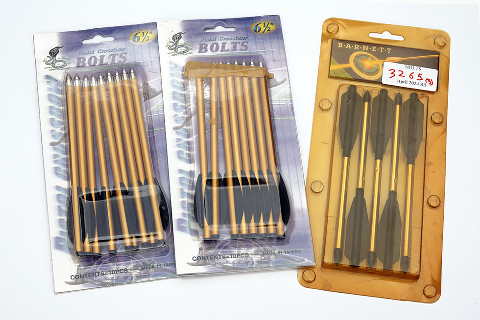 THREE PACKS OF PISTOL CROSSBOW BOLTS, 'BARNETT' approx 6 inch, pack of 5, in box